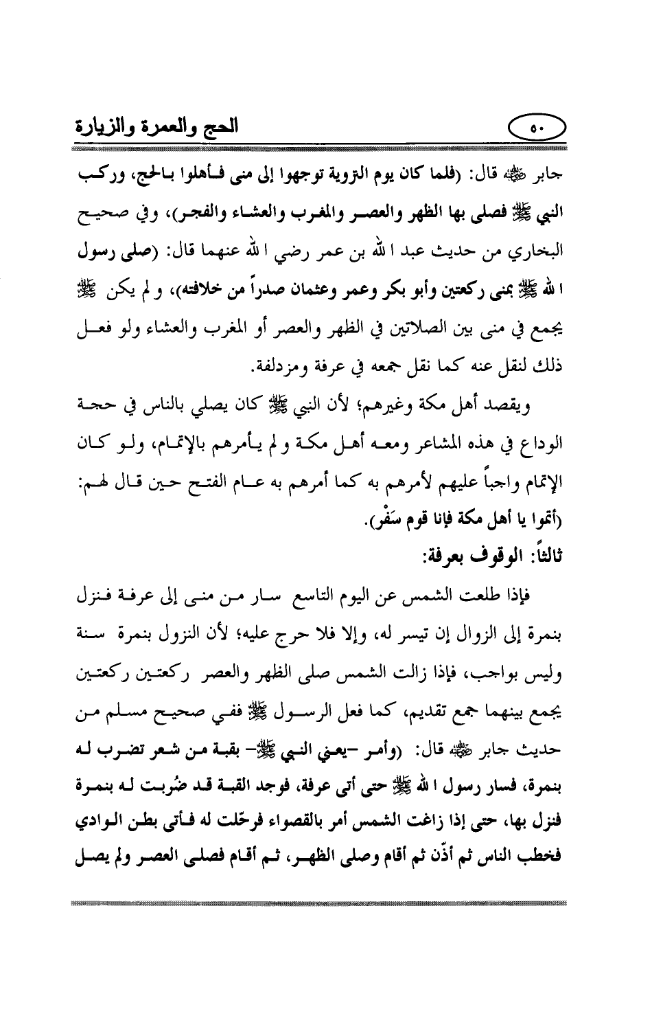 فإذا طلعت الشمس عن اليوم التاسع سار من منى إلى عرفة فنزل بنمرة إلى الزوال إن تيسر له، وإلا فلا حرج عليه؛ لأن النزول بنمرة سنة وليس بواجب، فإذا زالت الشمس صلى الظهر والعصر ركعتين ركعتين يجمع بينهما جمع تقديم، كما فعل الرسول صلي الله عليه وسلم ففي صحيح مسلم من حديث جابر رضي الله عنه قال:"وأمر -يعني النبي صلي الله عليه وسلم- بقبة من شعر تضرب له بنمرة، فسار رسول الله صلي الله عليه وسلم حتى أتى عرفة، فوجد القبة قد ضُربت له بنمرة فنزل بها، حتى إذا زاغت الشمس أمر بالقصواء فرحّلت له فأتى بطن الوادي فخطب الناس ثم أذّن ثم أقام وصلى الظهر، ثم أقام فصلى العصر ولم يصل