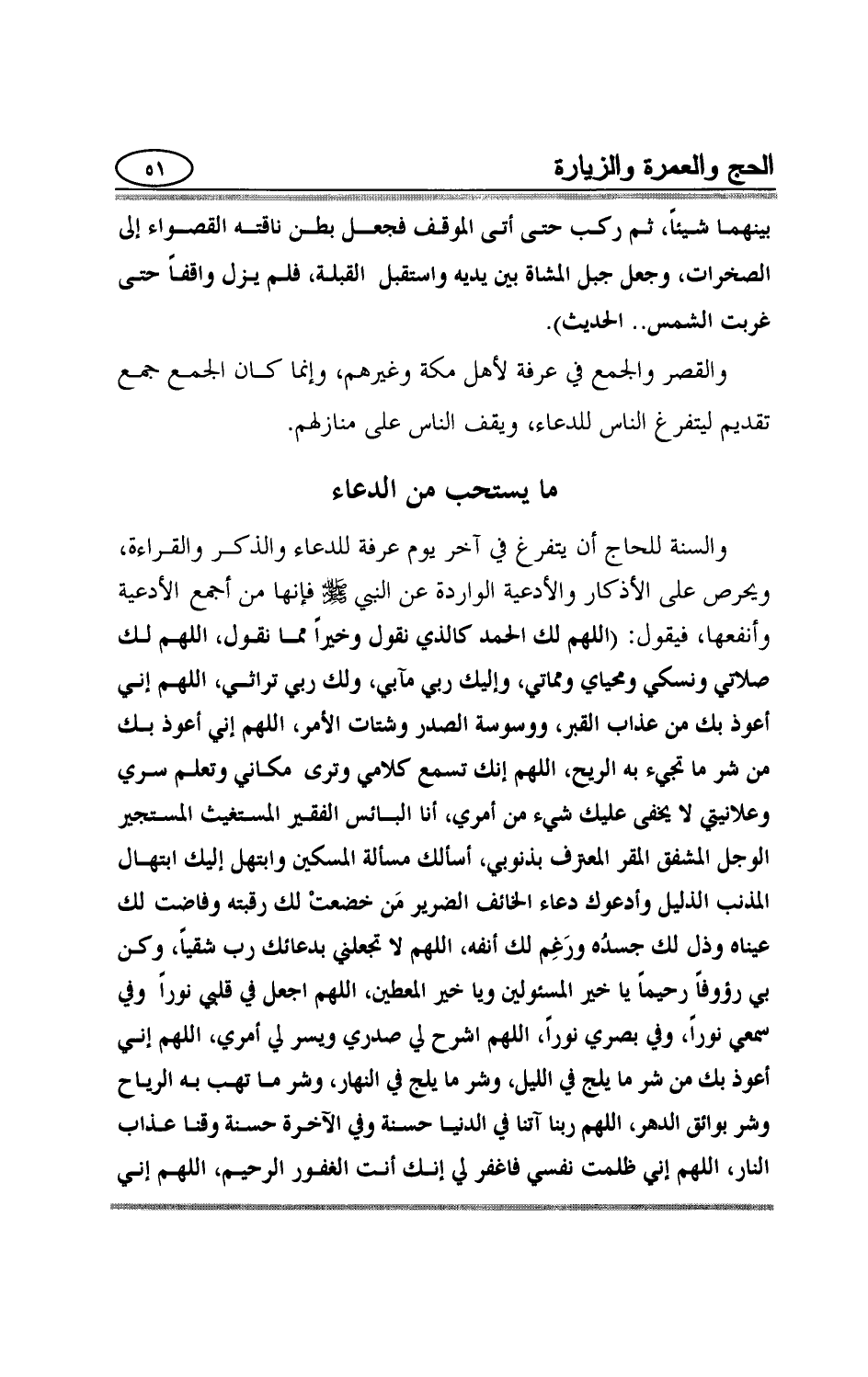بينهما شيئاً، ثم ركب حتى أتى الموقف فجعل بطن ناقته القصواء إلى الصخرات، وجعل جبل المشاة بين يديه واستقبل القبلة، فلم يزل واقفاً حتى غربت الشمس. الحديث"والقصر والجمع في عرفة لأهل مكة وغيرهم، وإنما كان الجمع جمع تقديم ليتفرغ الناس للدعاء، ويقف الناس على منازلهم.