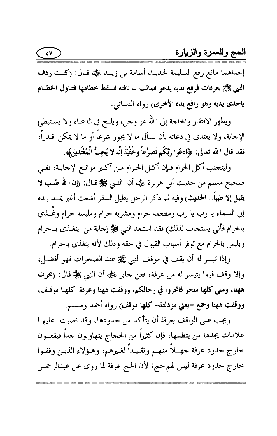 إحداهما مانع رفع السليمة لحديث أسامة بن زيد رضي الله عنه قال:"كنت ردف النبي صلي الله عليه وسلم بعرفات فرفع يديه يدعو فمالت به ناقته فسقط خطامها فتناول الخطام بإحدى يديه وهو رافع يده الأخرى " رواه النسائي ويظهر الافتقار والحاجة إلى الله عز وجل، ويلح في الدعاء ولا يستبطئ الإجابة، ولا يعتدى في دعائه بأن يسأل ما لا يجوز شرعاً أو ما لا يمكن قدراً، فقد قال الله تعالى: {ادْعُوا رَبَّكُمْ تَضَرُّعاً وَخُفْيَةً إِنَّهُ لا يُحِبُّ الْمُعْتَدِينَ} وليتجنب أكل الحرام فإن أكل الحرام من أكبر موانع الإجابة، ففي صحيح مسلم من حديث أبي هريرة رضي الله عنه أن النبي صلي الله عليه وسلم قال:"إن الله طيب لا يقبل إلا طيباً.. الحديث" وفيه ثم ذكر الرجل يطيل السفر أشعث أغبر يمد يده إلى السماء يا رب يا رب ومطعمه حرام ومشربه حرام وملبسه حرام وغُذي بالحرام فأنى يستجاب لذلك" فقد استبعد النبي صلي الله وسلم إجابة من يتغذى بالحرام ويلبس بالحرام مع توفر أسباب القبول في حقه وذلك لأنه يتغذى بالحرام وإذا تيسر له أن يقف في موقف النبي صلي عليه وسلم عند الصخرات فهو أفضل، وإلا وقف فيما يتيسر له من عرفة، فعن جابر رضي الله عنه أن النبي صلي الله عليه وسلم قال:"نحرت ههنا، ومنى كلها منحر فانحروا في رحالكم، ووقفت ههنا وعرفة كلها موقف، ووقفت ههنا وجمع -يعني مزدلفة- كلها موقف" رواه أحمد ومسلم ويجب على الواقف بعرفة أن يتأكد من حدودها، وقد نصبت عليها علامات يجدها من يتطلبها، فإن كثيراً من الحجاج يتهاونون جداً فيقفون خارج حدود عرفة جهلاً منهم وتقليداً لغيرهم، وهؤلاء الذين وقفوا خارج حدود عرفة ليس لهم حج؛ لأن الحج عرفة لما روى عن عبد الرحمن