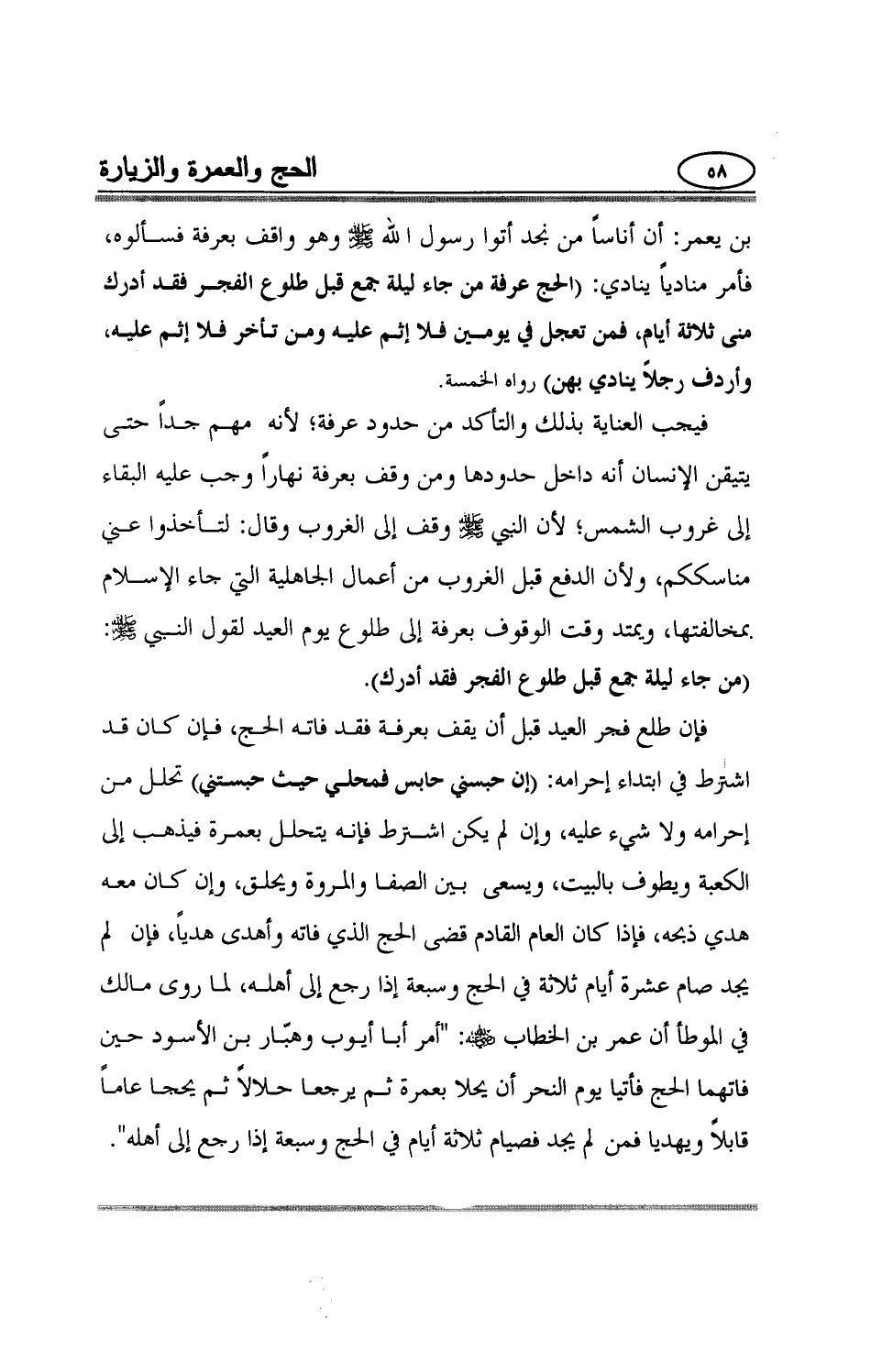 بن يعمر: أن أناساً من نجد أتوا رسول الله صلي الله عليه وسلم وهو واقف بعرفة فسألوه، فأمر منادياً ينادي:"الحج عرفة من جاء ليلة جمع قبل طلوع الفجر فقد أدرك منى ثلاثة أيام، فمن تعجل في يومين فلا إثم عليه ومن تأخر فلا إثم عليه، وأردف رجلاً ينادي بهن"رواه الخمسة فيجب العناية بذلك والتأكد من حدود عرفة؛ لأنه مهم جداً حتى يتيقن الإنسان أنه داخل حدودها ومن وقف بعرفة نهاراً وجب عليه البقاء إلى غروب الشمس؛ لأن النبي صلي الله عليه وسلم وقف إلى الغروب وقال: لتأخذوا عني مناسككم، ولأن الدفع قبل الغروب من أعمال الجاهلية التي جاء الإسلام بمخالفتها، ويمتد وقت الوقوف بعرفة إلى طلوع يوم العيد لقول النبي صلي الله عليه وسلم:"من جاء ليلة جمع قبل طلوع الفجر فقد أدرك" فإن طلع فجر العيد قبل أن يقف بعرفة فقد فاته الحج، فإن كان قد اشترط في ابتداء إحرامه:"إن حبسني حابس فمحلي حيث حبستني" تحلل من إحرامه ولا شيء عليه، وإن لم يكن اشترط فإنه يتحلل بعمرة فيذهب إلى الكعبة ويطوف بالبيت، ويسعى بين الصفا والمروة ويحلق، وإن كان معه هدي ذبحه، فإذا كان العام القادم قضى الحج الذي فاته وأهدى هدياً، فإن لم يجد صام عشرة أيام ثلاثة في الحج وسبعة إذا رجع إلى أهله، لما روى مالك في الموطأ أن عمر بن الخطاب رضي الله عنه:"أمر أبا أيوب وهبّار بن الأسود حين فاتهما الحج فأتيا يوم النحر أن يحلا بعمرة ثم يرجعا حلالاً ثم يحجا عاماً قابلاً ويهديا فمن لم يجد فصيام ثلاثة أيام في الحج وسبعة إذا رجع إلى أهله".