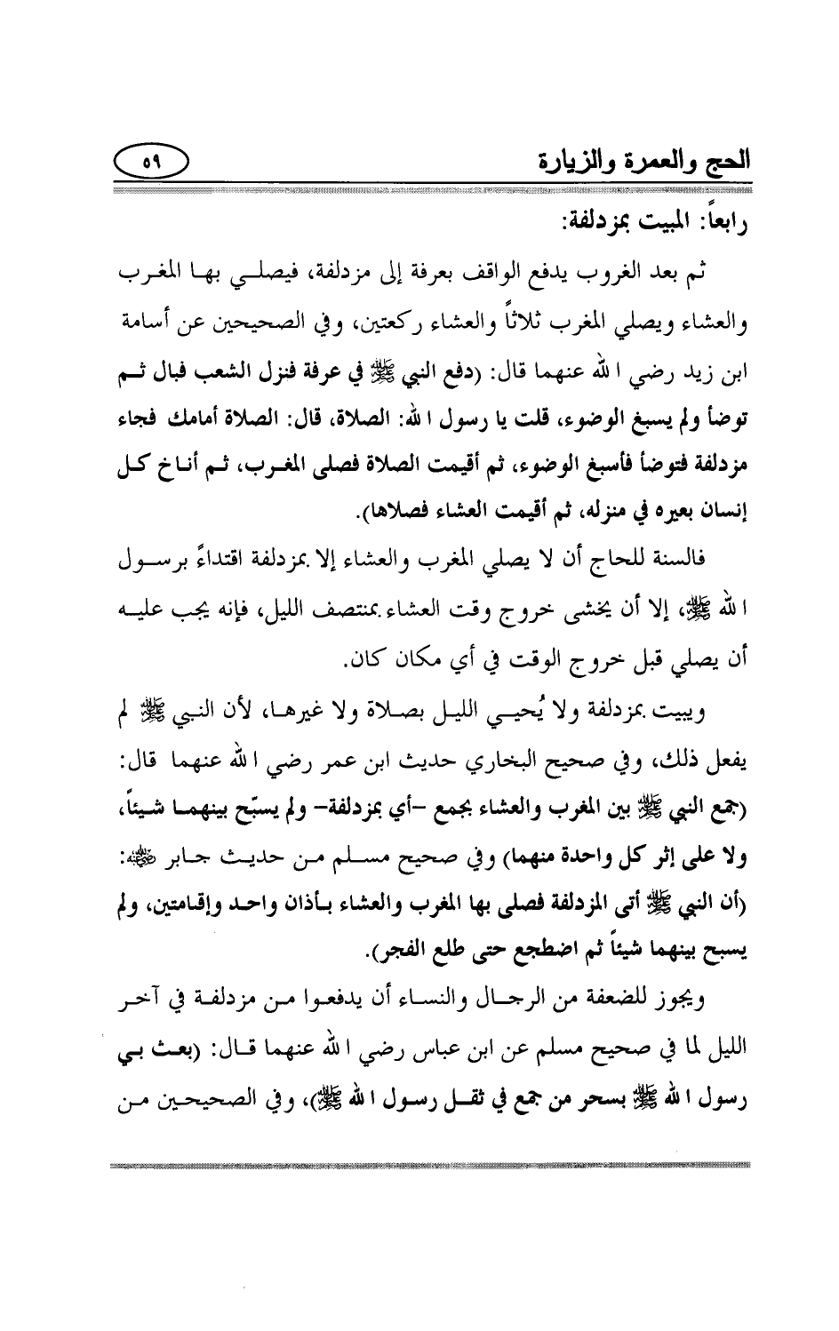 ثم بعد الغروب يدفع الواقف بعرفة إلى مزدلفة، فيصلي بها المغرب والعشاء ويصلي المغرب ثلاثاً والعشاء ركعتين، وفي الصحيحين عن أسامة ابن زيد رضي الله عنهما قال:"دفع النبي صلي الله عليه وسلم في عرفة فنزل الشعب فبال ثم توضأ ولم يسبغ الوضوء، قلت يا رسول الله: الصلاة، قال: الصلاة أمامك فجاء مزدلفة فتوضأ فأسبغ الوضوء، ثم أقيمت الصلاة فصلى المغرب، ثم أناخ كل إنسان بعيره في منزله، ثم أقيمت العشاء فصلاها" فالسنة للحاج أن لا يصلي المغرب والعشاء إلا بمزدلفة اقتداءً برسول الله صلي الله وعليه وسلم، إلا أن يخشى خروج وقت العشاء بمنتصف الليل، فإنه يجب عليه أن يصلي قبل خروج الوقت في أي مكان كان ويبيت بمزدلفة ولا يُحيي الليل بصلاة ولا غيرها، لأن النبي صلي الله عليه وسلم لم يفعل ذلك، وفي صحيح البخاري حديث ابن عمر رضي الله عنهما قال:"جمع النبي صلي الله وعليه وسلم بين المغرب والعشاء بجمع -أي بمزدلفة- ولم يسبّح بينهما شيئاً، ولا على إثر كل واحدة منهما" وفي صحيح مسلم من حديث جابر رضي الله عنه:"أن النبي صلي الله عليه وسلم أتى المزدلفة فصلى بها المغرب والعشاء بأذان واحد وإقامتين، ولم يسبح بينهما شيئاً ثم اضطجع حتى طلع الفجر" ويجوز للضعفة من الرجال والنساء أن يدفعوا من مزدلفة في آخر الليل لما في صحيح مسلم عن ابن عباس رضي الله عنهما قال:"بعث بي رسول الله صلي الله وسلم بسحر من جمع في ثقل رسول الله صلي الله عليه وسلم"، وفي الصحيحين من