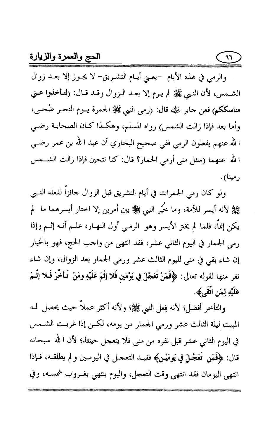 والرمي في هذه الأيام -يعني أيام التشريق- لا يجوز إلا بعد زوال الشمس، لأن النبي صلي الله عليه وسلم لم يرم إلا بعد الزوال وقد قال:"لتأخذوا عني مناسككم" فعن جابر رضي الله عنه قال:"رمى النبي صلي الله عليه وسلم الجمرة يوم النحر ضُحى، وأما بعد فإذا زالت الشمس" رواه المسلم، وهكذا كان الصحابة رضي الله عنهم يفعلون الرمي ففي صحيح البخاري أن عبد الله بن عمر رضي الله عنهما "سئل متى أرمي الجمار؟ قال: كنا نتحين فإذا زالت الشمس رمينا" ولو كان رمي الجمرات في أيام التشريق قبل الزوال جائزاً لفعله النبي صلي الله عليه وسلم لأنه أيسر للأمة، وما خُيّر النبي صلي الله عليه وسلم بين أمرين إلا اختار أيسرهما ما لم يكن إثماً، فلما لم يختر الأيسر وهو الرمي أول النهار، علم أنه إثم وإذا رمى الجمار في اليوم الثاني عشر، فقد انتهى من واجب الحج، فهو بالخيار إن شاء بقي في منى لليوم الثالث عشر ورمى الجمار بعد الزوال، وإن شاء نفر منها لقوله تعالى: {فَمَنْ تَعَجَّلَ في يَوْمَينِ فَلا إثْمَ عَلَيْهِ ومَنْ تَأخَّرَ فَلا إثْمَ عَلَيْهِ لِمَن اتَّقَى} والتأخر أفضل؛ لأنه فِعل النبي صلي الله عليه وسلم؛ ولأنه أكثر عملاً حيث يحصل له المبيت ليلة الثالث عشر ورمي الجمار من يومه، لكن إذا غربت الشمس في اليوم الثاني عشر قبل نفره من منى فلا يتعجل حينئذ؛ لأن الله سبحانه قال: {فَمَنْ تَعَجَّلَ في يَوْمَينِ} فقيد التعجل في اليومين ولم يطلقه، فإذا انتهى اليومان فقد انتهى وقت التعجل، واليوم ينتهي بغروب شمسه، وفي
