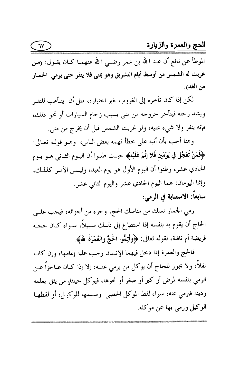 الموطأ عن نافع أن عبد الله بن عمر رضي الله عنهما كان يقول:"من غربت له الشمس من أوسط أيام التشريق وهو بمنى فلا ينفر حتى يرمي الجمار من الغد"لكن إذا كان تأخره إلى الغروب بغير اختياره، مثل أن يتأهب للنفر ويشد رحله فيتأخر خروجه من منى بسبب زحام السيارات أو نحو ذلك، فإنه ينفر ولا شيء عليه، ولو غربت الشمس قبل أن يخرج من منى وهنا أحب بأن أنبه على خطأ فهمه بعض الناس، وهو قوله تعالى: {فَمَنْ تَعَجَّلَ في يَوْمَينِ فَلا إثْمَ عَلَيْهِ} حيث ظنوا أن اليوم الثاني هو يوم الحادي عشر، وظنوا أن اليوم الأول هو يوم العيد، وليس الأمر كذلك، وإنما اليومان: هما اليوم الحادي عشر واليوم الثاني عشر.