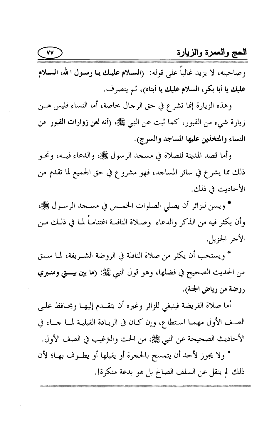 وصاحبيه، لا يزيد غالباً على قوله:"السلام عليك يا رسول الله، السلام عليك يا أبا بكر، السلام عليك يا أبتاه"، ثم ينصرف وهذه الزيارة إنما تشرع في حق الرجال خاصة، أما النساء فليس لهن زيارة شيء من القبور، كما ثبت عن النبي صلي الله عليه وسلم، "أنه لعن زوارات القبور من النساء والمتخذين عليها المساجد والسرج" وأما قصد المدينة للصلاة في مسجد الرسول صلي الله عليه وسلم، والدعاء فيه، ونحو ذلك مما يشرع في سائر المساجد، فهو مشروع في حق الجميع لما تقدم من الأحاديث في ذلك.