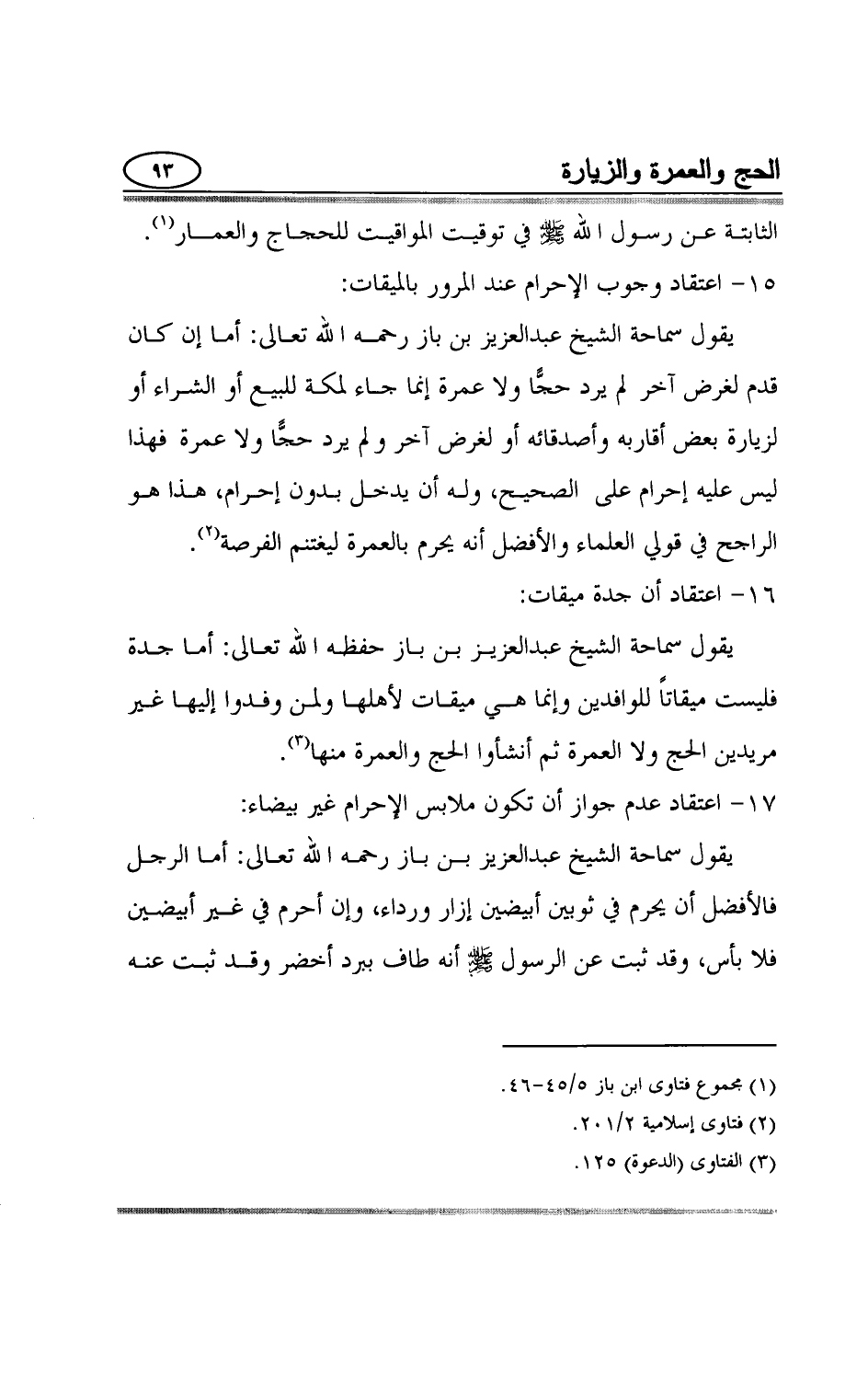 15- اعتقاد وجوب الإحرام عند المرور بالميقات: يقول سماحة الشيخ عبد العزيز بن باز رحمه الله تعالى: أما إن كان قدم لغرض آخر لم يرد حجًّا ولا عمرة إنما جاء لمكة للبيع أو الشراء أو لزيارة بعض أقاربه وأصدقائه أو لغرض آخر ولم يرد حجًّا ولا عمرة فهذا ليس عليه إحرام على الصحيح، وله أن يدخل بدون إحرام، هذا هو الراجح في قولي العلماء والأفضل أنه يحرم بالعمرة ليغتنم الفرصة2.