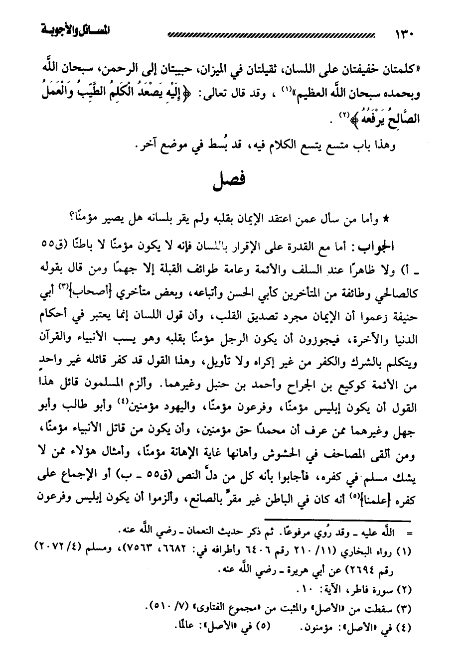 الجواب: أما مع القدرة على الإقرار باللسان فإنه لا يكون مؤمنًا لا باطنًا ولا ظاهرًا عند السلف والأئمة وعامة طوائف القبلة إلا جهمًا ومن قال بقوله كالصالحي وطائفة من المتأخرين كأبي الحسن وأتباعه، وبعض متأخري [أصحاب] أبي حنيفة زعموا أن الإيمان مجرد تصديق القلب، وأن قول اللسان إنما يعتبر في أحكام الدنيا والآخرة، فيجوزون أن يكون الرجل مؤمنًا بقلبه وهو يسب الأنبياء والقرآن ويتكلم بالشرك والكفر من غير إكراه ولا تأويل، وهذا القول قد كفر قائله غير واحدٍ من الأئمة كوكيع بن الجراح وأحمد بن حنبل وغيرهما. وألزم المسلمون قائل هذا القول أن يكون إبليس مؤمنًا، وفرعون مؤمنًا، واليهود مؤمنين وأبو طالب وأبو جهل وغيرهما ممن عرف أن محمدًا حق مؤمنين، وأن يكون من قاتل الأنبياء مؤمنًا، ومن ألقى المصاحف في الحشوش وأهانها غاية الإهانة مؤمنًا، وأمثال هؤلاء ممن لا يشك مسلم في كفره، فأجابوا بأنه كل من دلَّ النص أو الإجماع على كفره [علمنا] أنه كان في الباطن غير مقرٍّ بالصانع، وألزموا أن يكون إبليس وفرعون