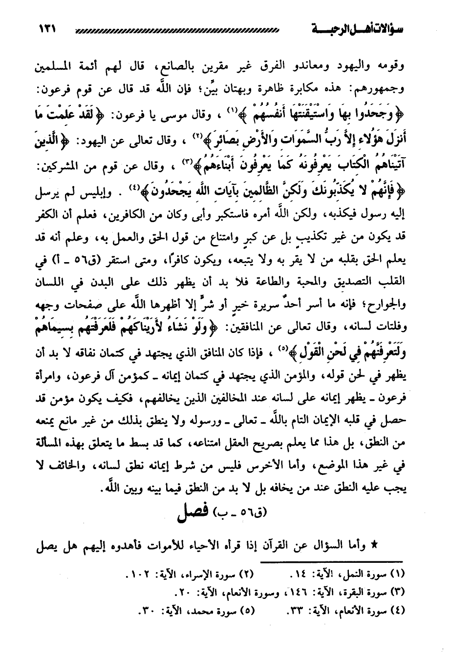 وقومه واليهود ومعاندو الفرق غير مقرين بالصانع، قال لهم أئمة المسلمين وجمهورهم: هذه مكابرة ظاهرة وبهتان بيِّن؛ فإن الله قد قال عن قوم فرعون: {وَجَحَدُوا بِهَا وَاسْتَيْقَنَتْهَا أَنْفُسُهُمْ} ، وقال موسى يا فرعون: {لَقَدْ عَلِمْتَ مَا أَنْزَلَ هَؤُلَاءِ إِلَّا رَبُّ السَّمَاوَاتِ وَالْأَرْضِ بَصَائِرَ} ، وقال تعالى عن اليهود: {الَّذِينَ آتَيْنَاهُمُ الْكِتَابَ يَعْرِفُونَهُ كَمَا يَعْرِفُونَ أَبْنَاءَهُمْ} ، وقال عن قوم من المشركين: {فَإِنَّهُمْ لَا يُكَذِّبُونَكَ وَلَكِنَّ الظَّالِمِينَ بِآيَاتِ اللَّهِ يَجْحَدُونَ} . وإبليس لم يرسل إليه رسول فيكذبه، ولكن الله أمره فاستكبر وأبى وكان من الكافرين، فعلم أن الكفر قد يكون من غير تكذيبٍ بل عن كبرٍ وامتناع من قول الحق والعمل به، وعلم أنه قد يعلم الحق بقلبه من لا يقر به ولا يتبعه، ويكون كافرًا، ومتى استقر في القلب التصديق والمحبة والطاعة فلا بد أن يظهر ذلك على البدن في اللسان والجوارح؛ فإنه ما أسر أحدٌ سريرة خيرٍ أو شرٍّ إلا أظهرها الله على صفحات وجهه وفلتات لسانه، وقال تعالى عن المنافقين: {وَلَوْ نَشَاءُ لَأَرَيْنَاكَهُمْ فَلَعَرَفْتَهُمْ بِسِيمَاهُمْ وَلَتَعْرِفَنَّهُمْ فِي لَحْنِ الْقَوْلِ} ، فإذا كان المنافق الذي يجتهد في كتمان نفاقه لا بد أن يظهر في لحن قوله، والمؤمن الذي يجتهد في كتمان إيمانه - كمؤمن آل فرعن، وامرأة فرعون - يظهر إيمانه على لسانه عند المخالفين الذين يخالفهم، فكيف يكون مؤمن قد حصل في قلبه الإيمان التام بالله - تعالى - ورسوله ولا ينطق بذلك من غير مانع يمنعه من النطق، بل هذا مما يعلم بصريح العقل امتناعه، كما قد بسط ما يتعلق بهذه المسألة في غير هذا الموضع، وأما الأخرس فليس من شرط إيمانه نطق لسانه، والخائف لا يجب عليه النطق عند من يخافه بل لا بد من النطق فيما بينه وبين الله.