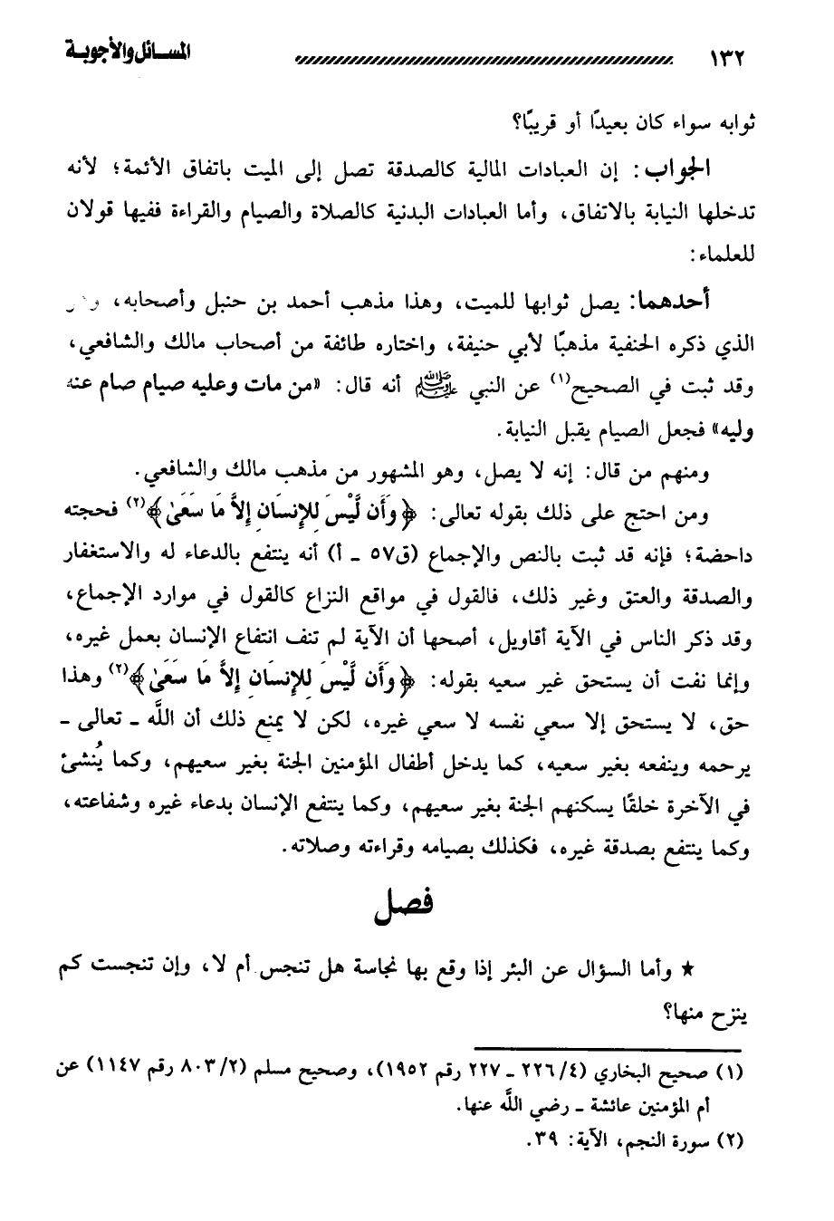 ومن احتج على ذلك بقوله تعالى: {وَأَنْ لَيْسَ لِلْإِنْسَانِ إِلَّا مَا سَعَى} فحجته داحضة؛ فإنه قد ثبت بالنص والإجماع أنه ينتفع بالدعاء له والاستغفار والصدقة والعتق وغير ذلك، فالقول في مواقع النزاع كالقول في موارد الإجماع، وقد ذكر الناس في الآية أقاويل، أصحها أن الآية لم تنف انتفاع الإنسان بعمل غيره، وإنما نفت أن يستحق غير سعيه بقوله: {وَأَنْ لَيْسَ لِلْإِنْسَانِ إِلَّا مَا سَعَى} وهذا حق، لا يستحق إلا سعي نفسه لا سعي غيره، لكن لا يمنع ذلك أن الله - تعالى - يرحمه وينفعه بغير سعيه، كما يدخل أطفال المؤمنين الجنة بغير سعيهم، وكما يُنشئ في الآخرة خلقًا يسكنهم الجنة بغير سعيهم، وكما ينتفع الإنسان بدعاء غيره وشفاعته، وكما ينتفع بصدقة غيره، فكذلك بصيامه وقراءته وصلاته.