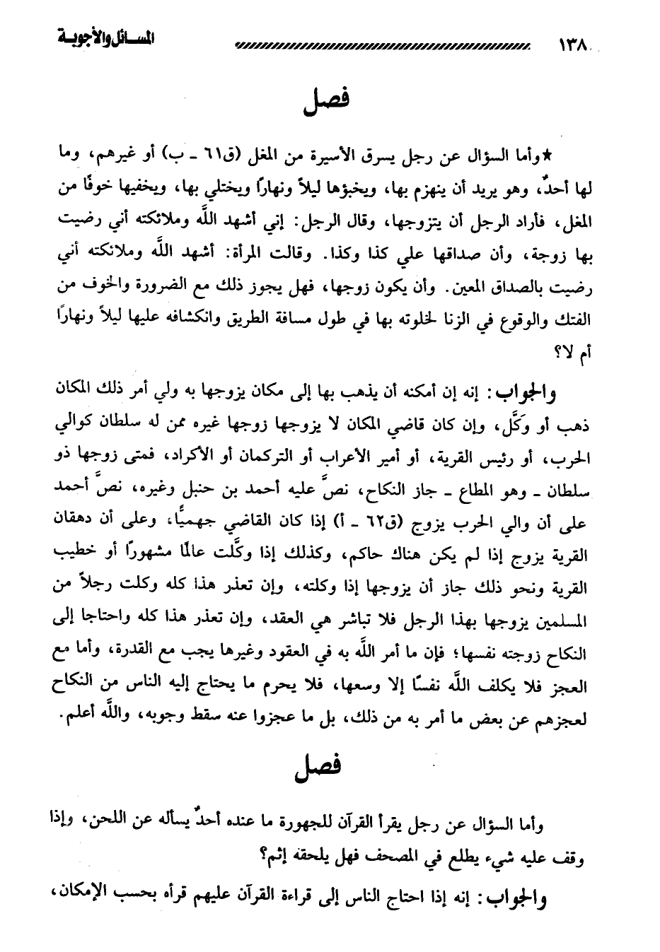 والجواب: إنه إن أمكنه أن يذهب بها إلى مكان يزوجها به ولي أمر ذلك المكان ذهب أو وَكَّل، وإن كان قاضي المكان لا يزوجها زوجها غيره ممن له سلطان كوالي الحرب، أو رئيس القرية، أو أمير الأعراب أو التركمان أو الأكراد، فمتى زوجها ذو سلطان - وهو المطاع - جاز النكاح، نصَّ عليه أحمد بن حنبل وغيره، نصَّ أحمد على أن والي الحرب يزوج إذا كان القاضي جهميًّا، وعلى أن دهقان القرية يزوج إذا لم يكن هناك حاكم، وكذلك إذا وكَّلت عالمًا مشهورًا أو خطيب القرية ونحو ذلك جاز أن يزوجها إذا وكلته، وإن تعذر هذا كله وكلت رجلاً من المسلمين يزوجها بهذا الرجل فلا تباشر هي العقد، وإن تعذر هذا كله واحتاجا إلى النكاح زوجته نفسها؛ فإن ما أمر الله به في العقود وغيرها يجب مع القدرة، وأما مع العجز فلا يكلف الله نفسًا إلا وسعها، فلا يحرم ما يحتاج إليه الناس من النكاح لعجزهم عن بعض ما أمر به من ذلك، بل ما عجزوا عنه سقط وجوبه، والله أعلم.