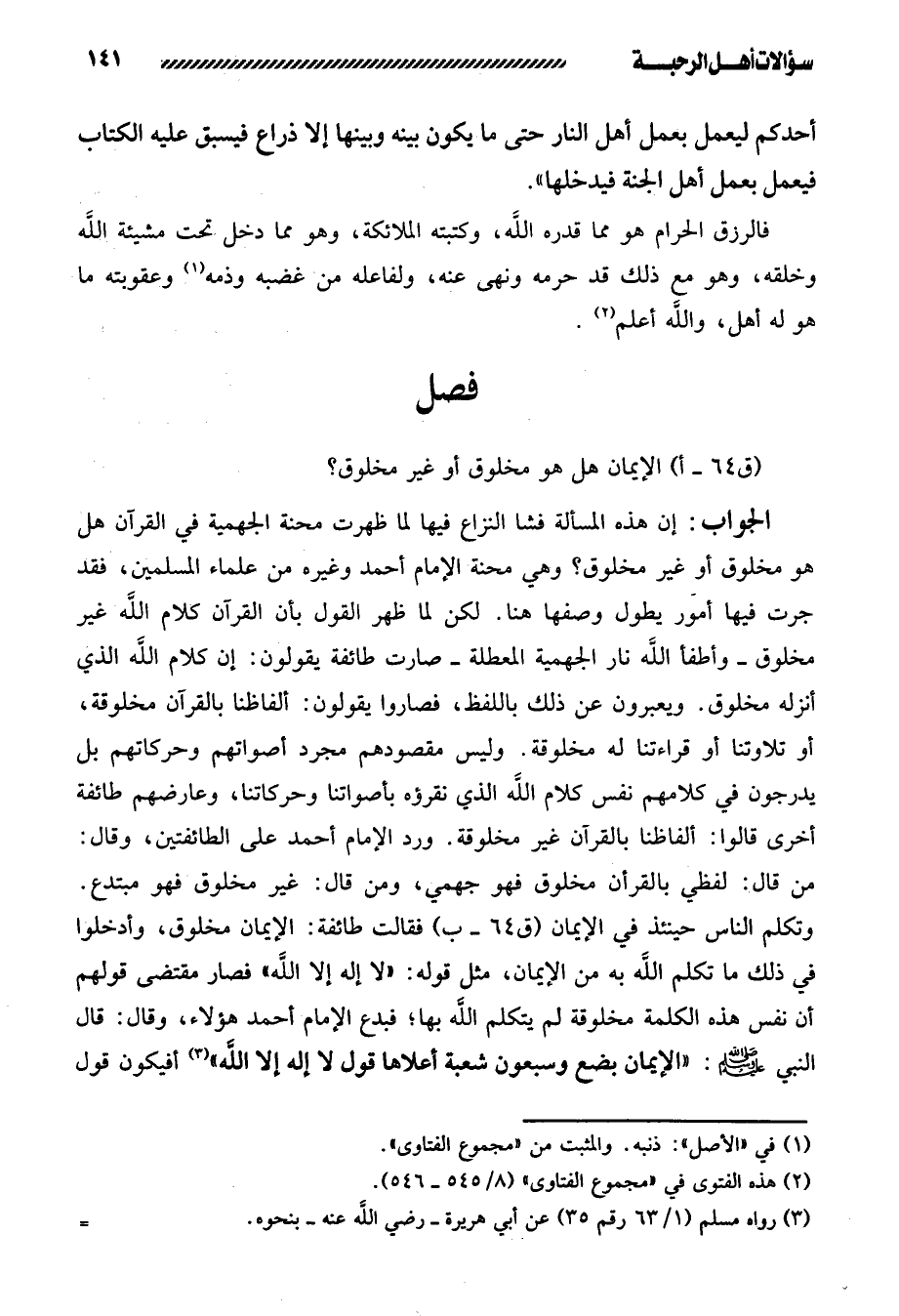 الْإِيمَانُ هَلْ هُوَ مَخْلُوقٌ أَوْ غَيْرُ مَخْلُوقٍ؟