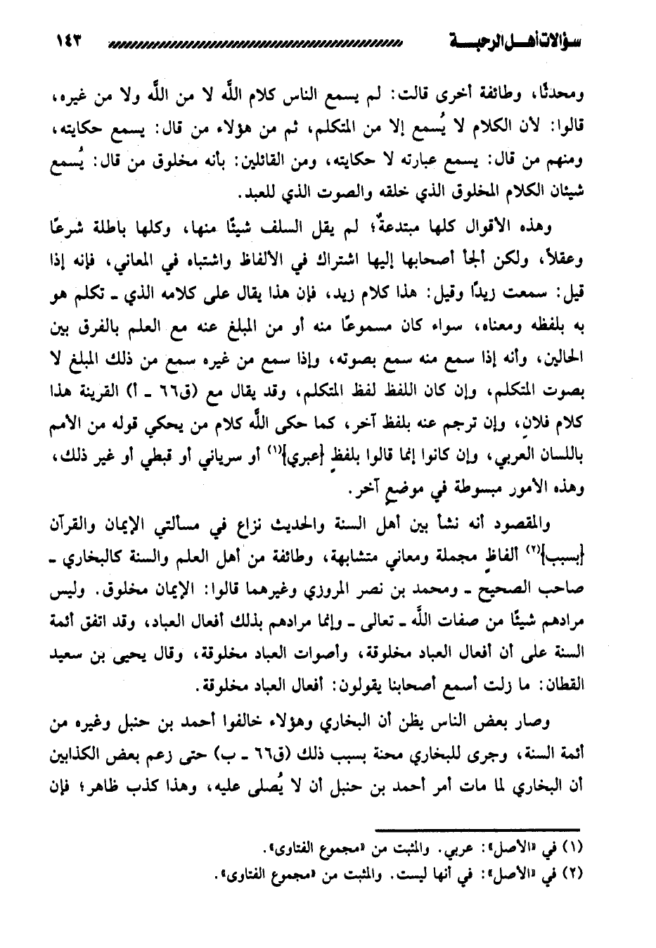 وَالْمَقْصُودُ أَنَّهُ نَشَأَ بَيْنَ أَهْلِ السُّنَّةِ وَالْحَدِيثِ نِزَاع فِي مَسْأَلَتَيْ الْإِيمَانِ والْقُرْآنِ [بِسَبَبِ] أَلْفَاظٍ مُجْمَلَةٍ وَمَعَانِي مُتَشَابِهَةٍ، وَطَائِفَةٍ مِنْ أَهْلِ الْعِلْمِ وَالسُّنَّةِ كَالْبُخَارِيِّ - صَاحِبِ الصَّحِيحِ - وَمُحَمَّدِ بْنِ نَصْرٍ الْمَرْوَزِي وَغَيْرِهِمَا قَالُوا: الْإِيمَانُ مَخْلُوقٌ. وَلَيْسَ مُرَادُهُمْ شَيْئًا مِنْ صِفَاتِ اللَّهِ - تعالى - وَإِنَّمَا مُرَادُهُمْ بِذَلِكَ أَفْعَالُ الْعِبَادِ، وَقَدْ اتَّفَقَ أَئِمَّةُ السنة (¬2) عَلَى أَنَّ أَفْعَالَ الْعِبَادِ مَخْلُوقَةٌ، وأصوات العباد مخلوقة، وَقَالَ يَحْيَى بْنُ سَعِيدٍ الْقَطَّانُ: مَا زِلْت أَسْمَعُ أَصْحَابَنَا يَقُولُونَ: أَفْعَالُ الْعِبَادِ مَخْلُوقَةٌ.