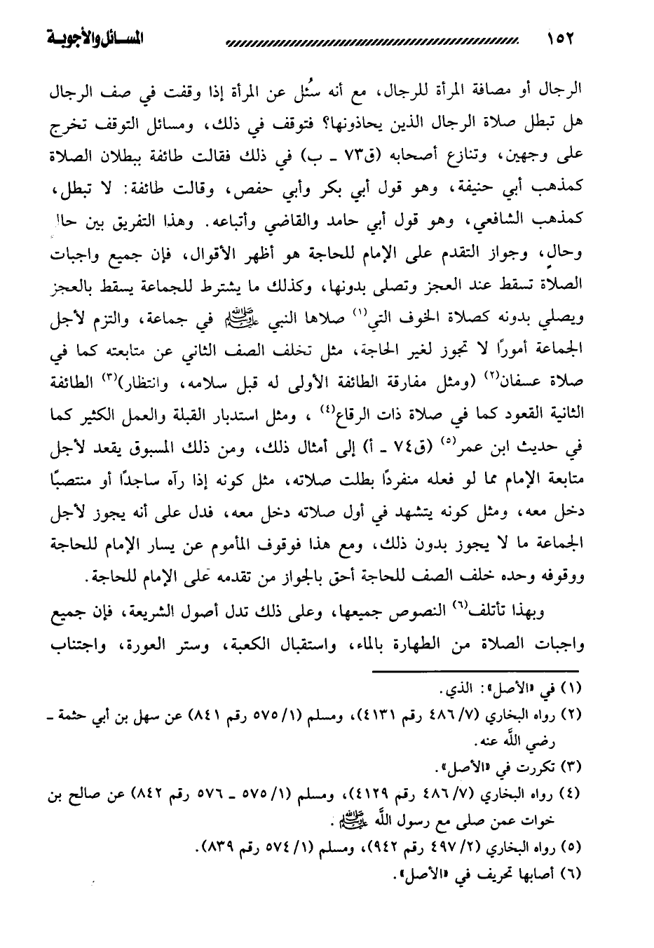 الرجال أو مصافة المرأة للرجال، مع أنه سُئل عن المرأة إذا وقفت في صف الرجال هل تبطل صلاة الرجال الذين يحاذونها؟ فتوقف في ذلك، ومسائل التوقف تخرج على وجهين، وتنازع أصحابه في ذلك فقالت طائفة ببطلان الصلاة كمذهب أبي حنيفة، وهو قول أبي بكر وأبي حفص، وقالت طائفة: لا تبطل، كمذهب الشافعي، وهو قول أبي حامد والقاضي وأتباعه. وهذا التفريق بين حالٍ وحالٍ، وجواز التقدم على الإمام للحاجة هو أظهر الأقوال، فإن جميع واجبات الصلاة تسقط عند العجز وتصلى بدونها، وكذلك ما يشترط للجماعة يسقط بالعجز ويصلى بدونه كصلاة الخوف التي صلاها النبي صلى الله عليه وسلم في جماعة، والتزم لأجل الجماعة أمورًا لا تجوز لغير الحاجة، مثل تخلف الصف الثاني عن عن متابعته كما في صلاة عسفان (ومثل مفارقة الطائفة الأولى له قبل سلامه، وانتظار) الطائفة الثانية القعود كما في صلاة ذات الرقاع، ومثل استدبار القبلة والعمل الكثير كما في حديث ابن عمر إلى أمثال ذلك، ومن ذلك المسبوق يقعد لأجل متابعة الإمام مما لو فعله منفردًا بطلت صلاته، مثل كونه إذا رآه ساجدًا أو منتصبًا دخل معه، ومثل كونه يتشهد في أول صلاته دخل معه، فدل على أنه يجوز لأجل الجماعة ما لا يجوز بدون ذلك، ومع هذا فوقوف المأموم عن يسار الإمام للحاجة ووقوفه وحده خلف الصف للحاجة أحق بالجواز من تقدمه على الإمام للحاجة.