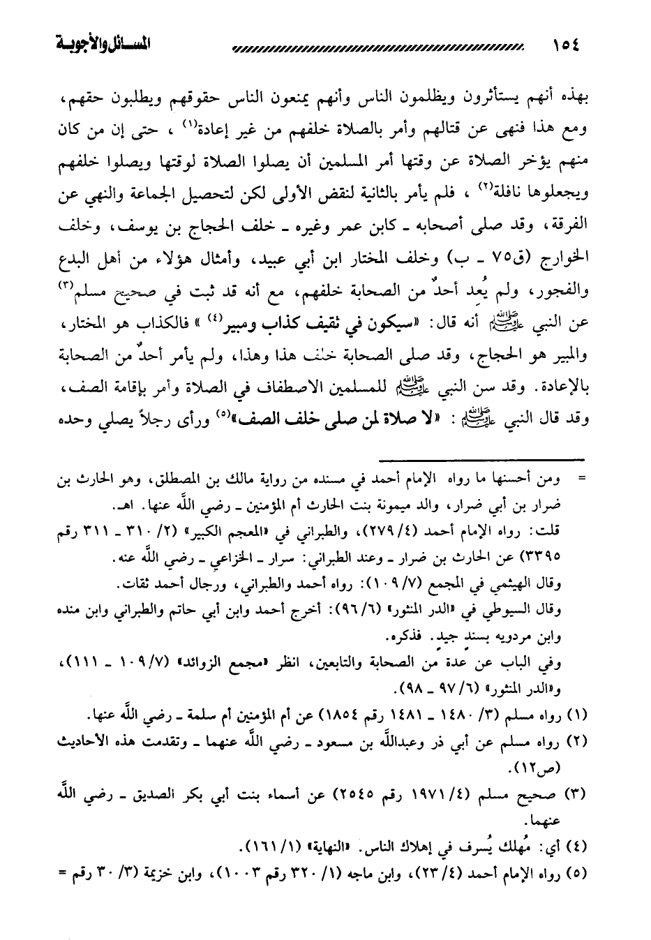 بهذه (¬1) أنهم يستأثرون ويظلمون الناس وأنهم يمنعون الناس حقوقهم ويطلبون حقهم، ومع هذا فنهى عن قتالهم وأمر بالصلاة خلفهم من غير إعادة، حتى إن من كان منهم يؤخر الصلاة عن وقتها أمر المسلمين أن يصلوا الصلاة لوقتها ويصلوا خلفهم ويجعلوها نافلة، فلم يأمر بالثانية لنقض الأولى لكن لتحصيل الجماعة والنهي عن الفرقة، وقد صلى أصحابه - كابن عمر وغيره - خلف الحجاج بن يوسف، وخلف الخوارج وخلف المختار ابن أبي عبيد، وأمثال هؤلاء من أهل البدع والفجور، ولم يُعِد أحدٌ من الصحابة خلفهم، مع أنه قد ثبت في صحيح مسلم عن النبي صلى الله عليه وسلم أنه قال: «سيكون في ثقيف كذاب ومبير» فالكذاب هو المختار، والمبير هو الحجاج، وقد صلى الصحابة خلف هذا وهذا، ولم يأمر أحدٌ من الصحابة بالإعادة. وقد سن النبي صلى الله عليه وسلم للمسلمين الاصطفاف في الصلاة وأمر بإقامة الصف، وقد قال النبي صلى الله عليه وسلم: «لا صلاة لمن صلى خلف الصف» ورأى رجلاً يصلي وحده