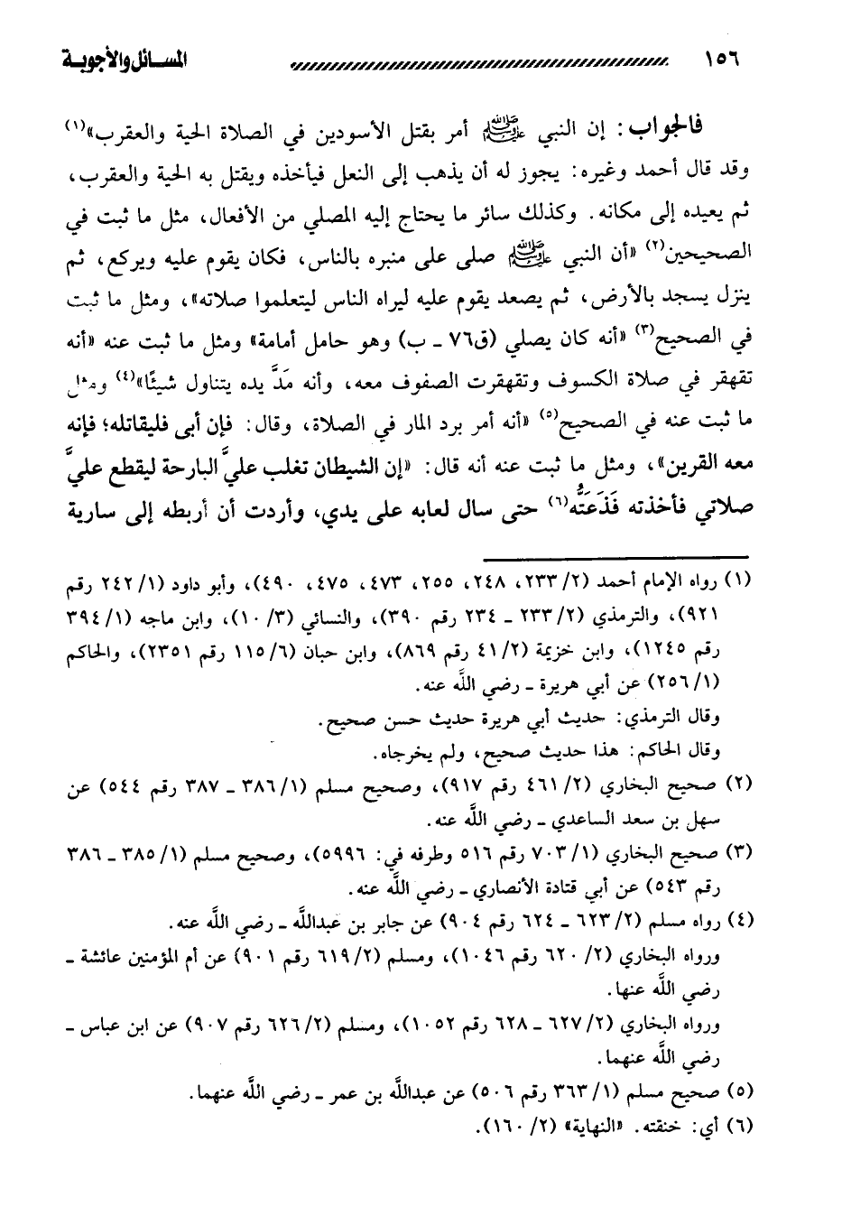 فالجواب: «إن النبي صلى الله عليه وسلم أمر بقتل الأسودين في الصلاة الحية والعقرب» وقد قال أحمد وغيره: يجوز له أن يذهب إلى النعل فيأخذه ويقتل به الحية والعقرب، ثم يعيده إلى مكانه. وكذلك سائر ما يحتاج إليه المصلي من الأفعال، مثل ما ثبت في الصحيحين «أن النبي صلى الله عليه وسلم صلى على منبره بالناس، فكان يقوم عليه ويركع، ثم ينزل يسجد بالأرض، ثم يصعد يقوم عليه ليراه الناس ليتعلموا صلاته» ، ومثل ما ثبت في الصحيح «أنه كان يصلي وهو حامل أمامة» ومثل ما ثبت عنه «أنه تقهقر في صلاة الكسوف وتقهقرت الصفوف معه، وأنه مَدَّ يده يتناول شيئًا» ومثل ما ثبت عنه في الصحيح «أنه أمر برد المار في الصلاة، وقال: فإن أبى فليقاتله؛ فإنه معه القرين» ، ومثل ما ثبت عنه أنه قال: «إن الشيطان تغلب عليَّ البارحة ليقطع عليَّ صلاتي فأخذته فَذَعَتُّه حتى سال لعابه على يدي، وأردت أن أربطه إلى سارية
