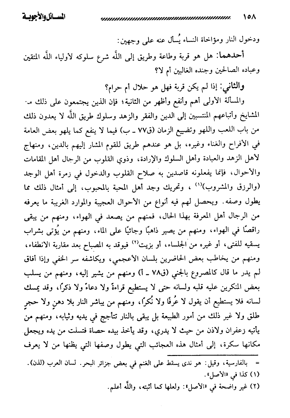 والمسألة الأولى أهم وأنفع وأظهر من الثانية؛ فإن الذين يجتمعون على ذلك من المشايخ وأتباعهم المنتسبين إلى الدين والفقر والزهد وسلوك طريق الله لا يعدون ذلك من باب اللعب واللهو وتضييع الزمان فيما لا ينفع كما يلهو بعض العامة في الأفراح والغناء وغيره، بل هو عندهم طريق للقوم المشار إليهم بالدين، ومنهاج لأهل الزهد والعبادة وأهل السلوك والإرادة، وذوي القلوب من الرجال أهل المقامات والأحوال، فإنما يفعلونه قاصدين به صلاح القلوب والدخول في زمرة أهل الوجد (والرزق والمشروب) (¬1) ، وتحريك وجد أهل المحبة بالمحبوب، إلى أمثال ذلك مما يطول وصفه. ويحصل لهم فيه أنواع من الأحوال العجيبة والموارد الغريبة ما يعرفه من الرجال أهل المعرفة بهذا الحال، فمنهم من يصعد في الهواء، ومنهم من يبقى راقصًا في الهواء، ومنهم من يصير ذاهبًا وجائيًا على الماء، ومنهم من يُؤتى بشراب يسقيه للفتى، أو غيره من الجلساء، أو بزيت فيوقد به المصباح بعد مقاربة الانطفاء، ومنهم من يخاطب بعض الحاضرين بلسان الأعجمي، ويكاشفه سر الخفي وإذا أفاق لم يدر ما قال كالمصروع بالجني ومنهم من يشير إليه، ومنهم من يسلب بعض المنكرين عليه قلبه ولسانه حتى لا يستطيع قراءةً ولا دعاءً ولا ذكرًا، وقد يمسك لسانه فلا يستطيع أن يقول لا عُرفًا ولا نُكرًا، ومنهم من يباشر النار بلا دهنٍ ولا حجرٍ طلق ولا غير ذلك من أمور الطبيعة بل يبقى بالنار تتأجج في يديه وثيابه، ومنهم من يأتيه زعفران ولاذن من حيث لا يدري، وقد يأخذ بيده حصاة فتسلت من يده ويجعل مكانها سكرة، إلى أمثال هذه العجائب التي يطول وصفها التي يظنها من لا يعرف