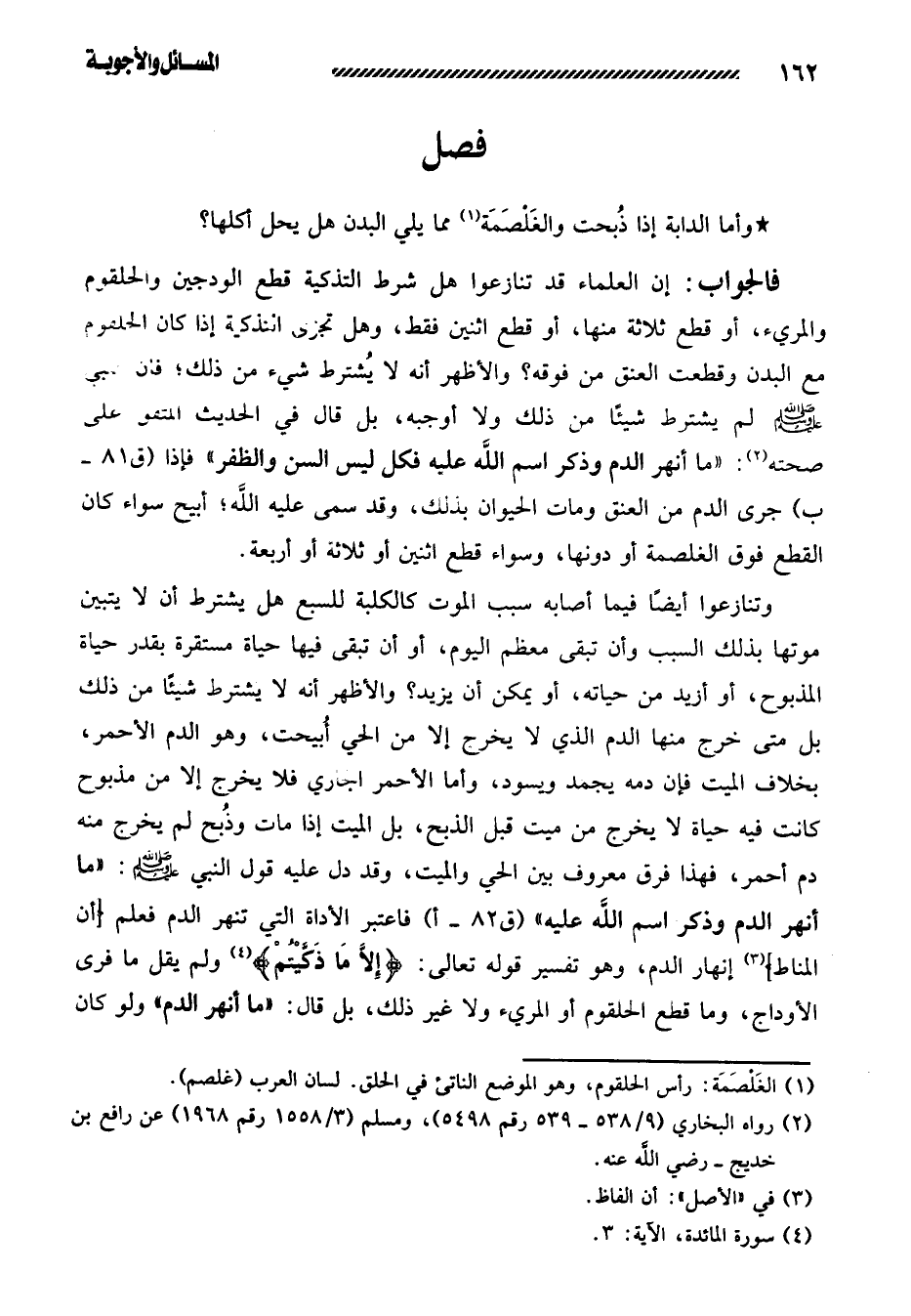 فالجواب: إن العلماء قد تنازعوا هل شرط التذكية قطع الودجين والحلقوم والمريء، أو قطع ثلاثة منها، أو قطع اثنين فقط، وهل تجزئ التذكية إذا كان الحلقوم مع البدن وقطعت العنق من فوقه؟ والأظهر أنه لا يُشترط شيء من ذلك؛ فإن النبي صلى الله عليه وسلم لم يشترط شيئًا من ذلك ولا أوجبه، بل قال في الحديث المتفق على صحته: «ما أنهر الدم وذكر اسم الله عليه فكل، ليس السن والظفر» فإذا جرى الدم من العنق ومات الحيوان بذلك، وقد سمى عليه الله؛ أبيح سواء كان القطع فوق الغلصمة أو دونها، وسواء قطع اثنين أو ثلاثة أو أربعة.