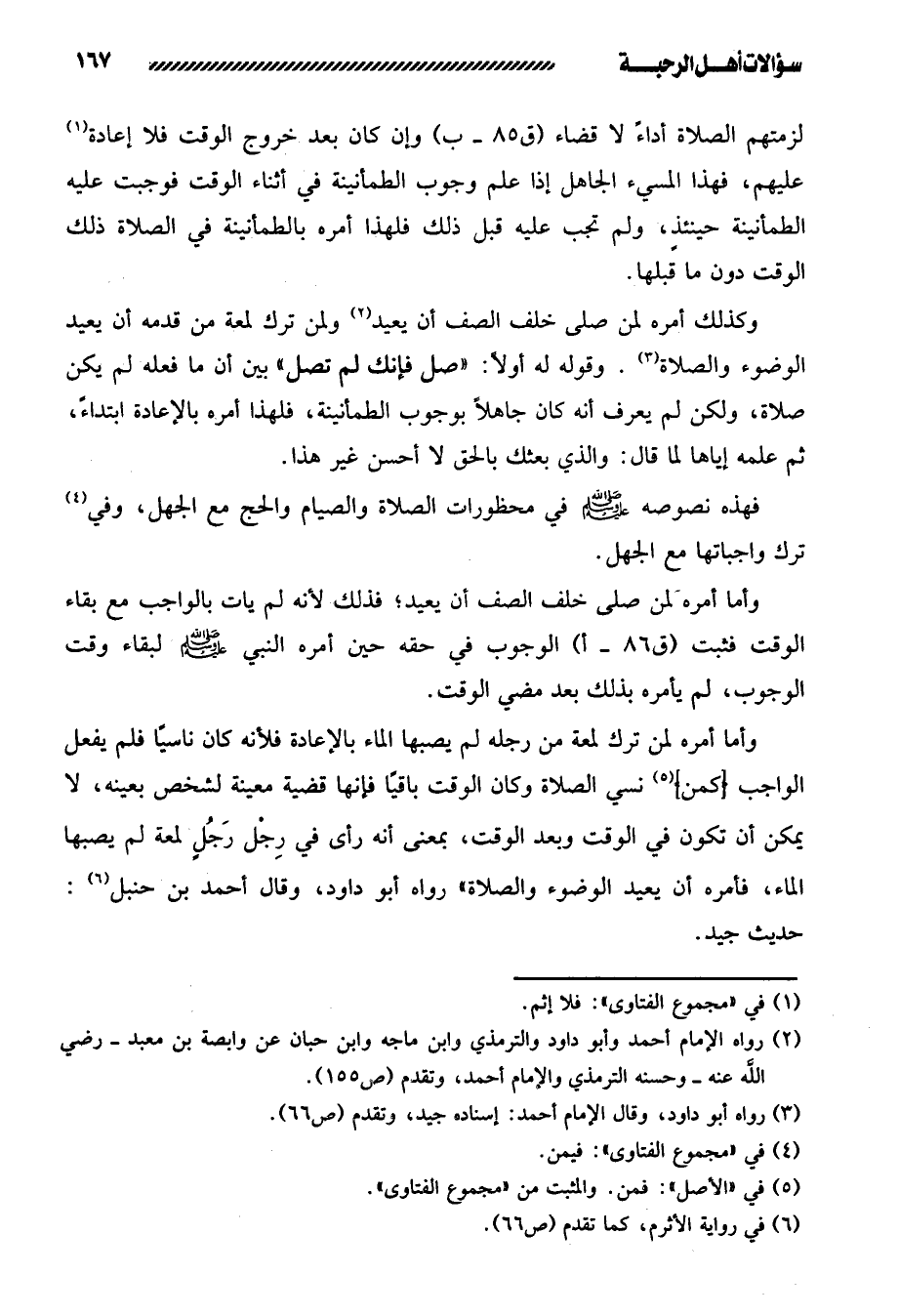 وَكَذَلِكَ أَمْرُهُ لِمَنْ صَلَّى خَلْفَ الصَّفِّ أَنْ يُعِيدَ، وَلِمَنْ تَرَكَ لَمْعَةً مِنْ قَدَمِهِ أَنْ يُعِيدَ الْوُضُوءَ وَالصَّلَاةَ. وَقَوْلُهُ له أَوَّلًا: «صَلِّ فَإِنَّك لَمْ تُصَلِّ» بَيَّنَ أَنَّ مَا فَعَلَهُ لَمْ يَكُنْ صَلَاةً، وَلَكِنْ لَمْ يَعْرِفْ أَنَّهُ كَانَ جَاهِلًا بِوُجُوبِ الطُّمَأْنِينَةِ، فَلِهَذَا أَمَرَهُ بِالْإِعَادَةِ ابْتِدَاءً، ثُمَّ عَلَّمَهُ إيَّاهَا لَمَّا قَالَ: وَاَلَّذِي بَعَثَك بِالْحَقِّ لَا أُحْسِنُ غَيْرَ هَذَا.