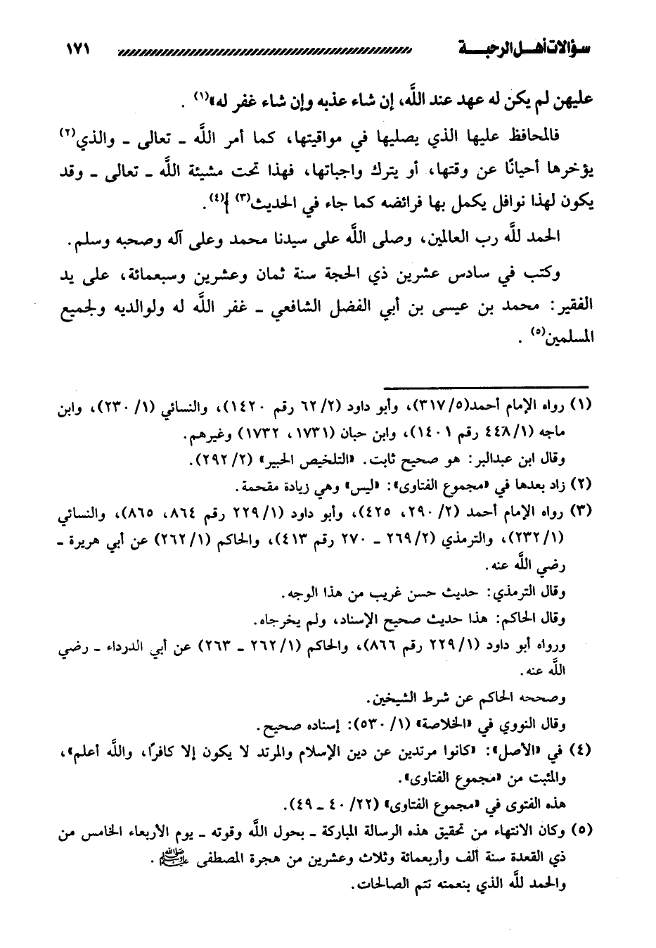 فَالْمُحَافِظُ عَلَيْهَا الَّذِي يُصَلِّيهَا فِي مَوَاقِيتِهَا، كَمَا أَمَرَ اللَّهُ - تَعَالَى - وَاَلَّذِي يُؤَخِّرُهَا أَحْيَانًا عَنْ وَقْتِهَا، أَوْ يَتْرُكُ وَاجِبَاتِهَا، فَهَذَا تَحْتَ مَشِيئَةِ اللَّهِ - تَعَالَى - وَقَدْ يَكُونُ لِهَذَا نَوَافِلُ يُكَمِّلُ بِهَا فَرَائِضَهُ كَمَا جَاءَ فِي الْحَدِيثِ] (¬1) .