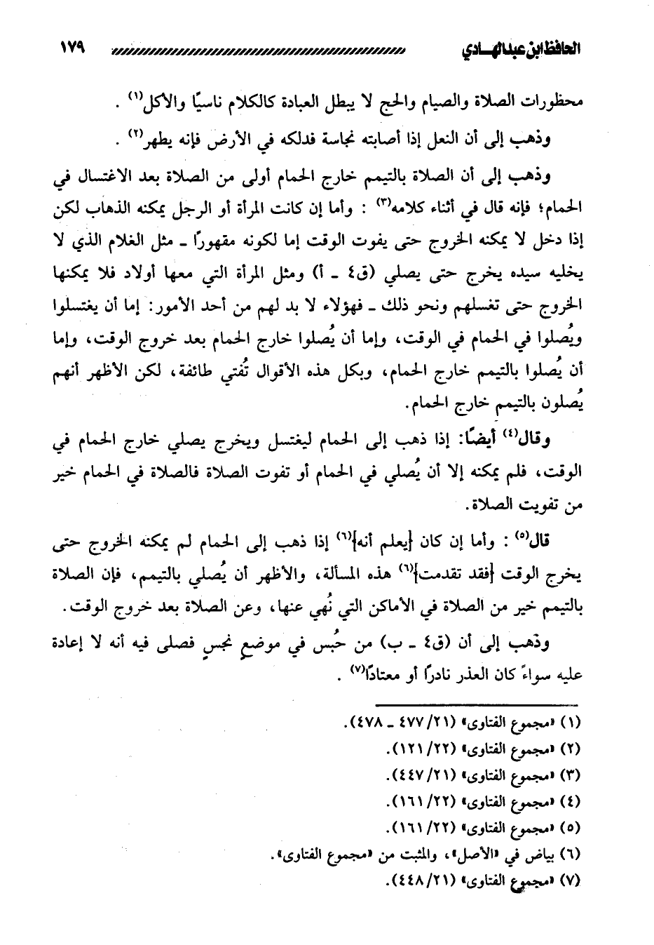 30- وذهب إلى أن الصلاة بالتيمم خارج الحمام أولى من الصلاة بعد الاغتسال في الحمام؛ فإنه قال في أثناء كلامه: وأما إن كانت المرأة أو الرجل يمكنه الذهاب لكن إذا دخل لا يمكنه الخروج حتى يفوت الوقت إما لكونه مقهورًا - مثل الغلام الذي لا يخليه سيده يخرج حتى يصلي / ومثل المرأة التي معها أولاد فلا يمكنها الخروج حتى تغسلهم ونحو ذلك - فهؤلاء لا بد لهم من أحد الأمور: إما أن يغتسلوا ويُصلوا في الحمام في الوقت، وإما أن يُصلوا خارج الحمام، وبكل هذه الأقوال تُفتي طائفة، لكن الأظهر أنهم يُصلون بالتيمم خارج الحمام.