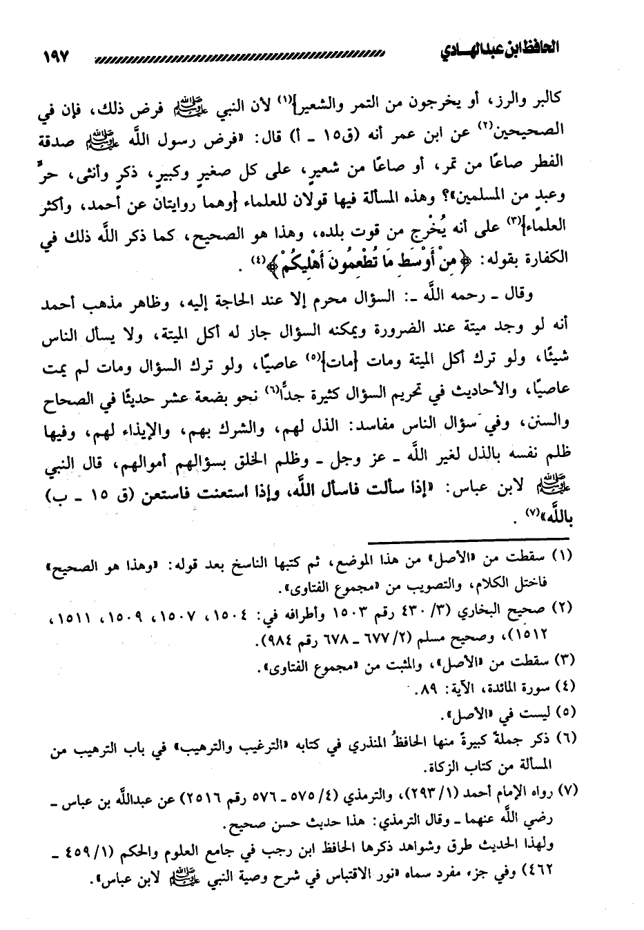 90- وقال - رحمه الله -: السؤال محرَّمٌ إلاّ عند الحاجة إليه، وظاهر مذهب أحمد أنه لو وجد ميتةً عند الضرورة ويُمكِنه السؤال جاز له أكلُ الميتةِ، ولا يسأل الناس شيئًا، ولو ترك أكل الميتة وماتَ [ماتَ] عاصيًا، ولو ترك السؤالَ وماتَ لم يَمُتْ عاصيًا، والأحاديث في تحريم السؤال كثيرة جدًّا نحو بضعة عشر حديثًا في الصحاح والسنن، وفي سؤال الناس مفاسدُ: الذّلّ لهم، والشرك بهم، والإيذاء لهم، وفيها ظلم نفسه بالذل لغير الله - عزّ وجل - وظلمٌ الخلق بسؤالهم أموالهم، قال النبي صَلَّى اللَّهُ عَلَيْهِ وَسَلَّمَ لابن عباس: «إذا سالتَ فاسألِ الله، وإذا استعنتَ فاستعنْ / بالله» .