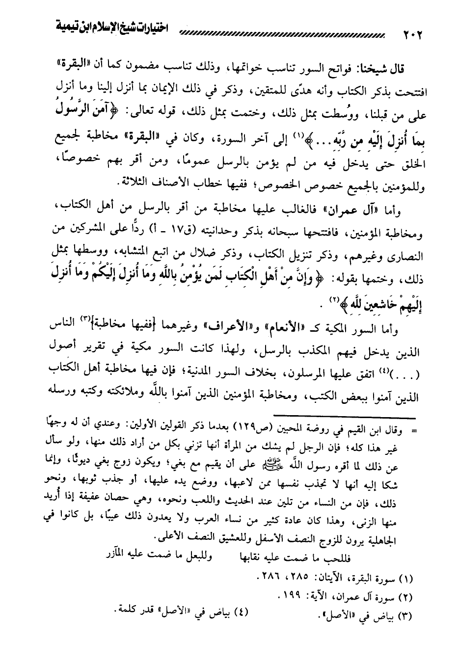96- قال شيخنا: فواتح السور تناسب خواتمها، وذلك تناسب مضمون كما أن «البقرة» افتتحت بذكر الكتاب وأنه هدًى للمتقين، وذكر في ذلك الإيمان بما أنزل إلينا وما أنزل على من قبلنا، ووُسطت بمثل ذلك، وختمت بمثل ذلك، قوله تعالى: {آمَنَ الرَّسُولُ بِمَا أُنْزِلَ إِلَيْهِ مِنْ رَبِّهِ ... } إلى آخر السورة، وكان في «البقرة» مخاطبة لجميع الخلق حتى يدخل فيه من لم يؤمن بالرسل عمومًا، ومن أقر بهم خصوصًا، وللمؤمنين بالجميع خصوص الخصوص؛ ففيها خطاب الأصناف الثلاثة.
