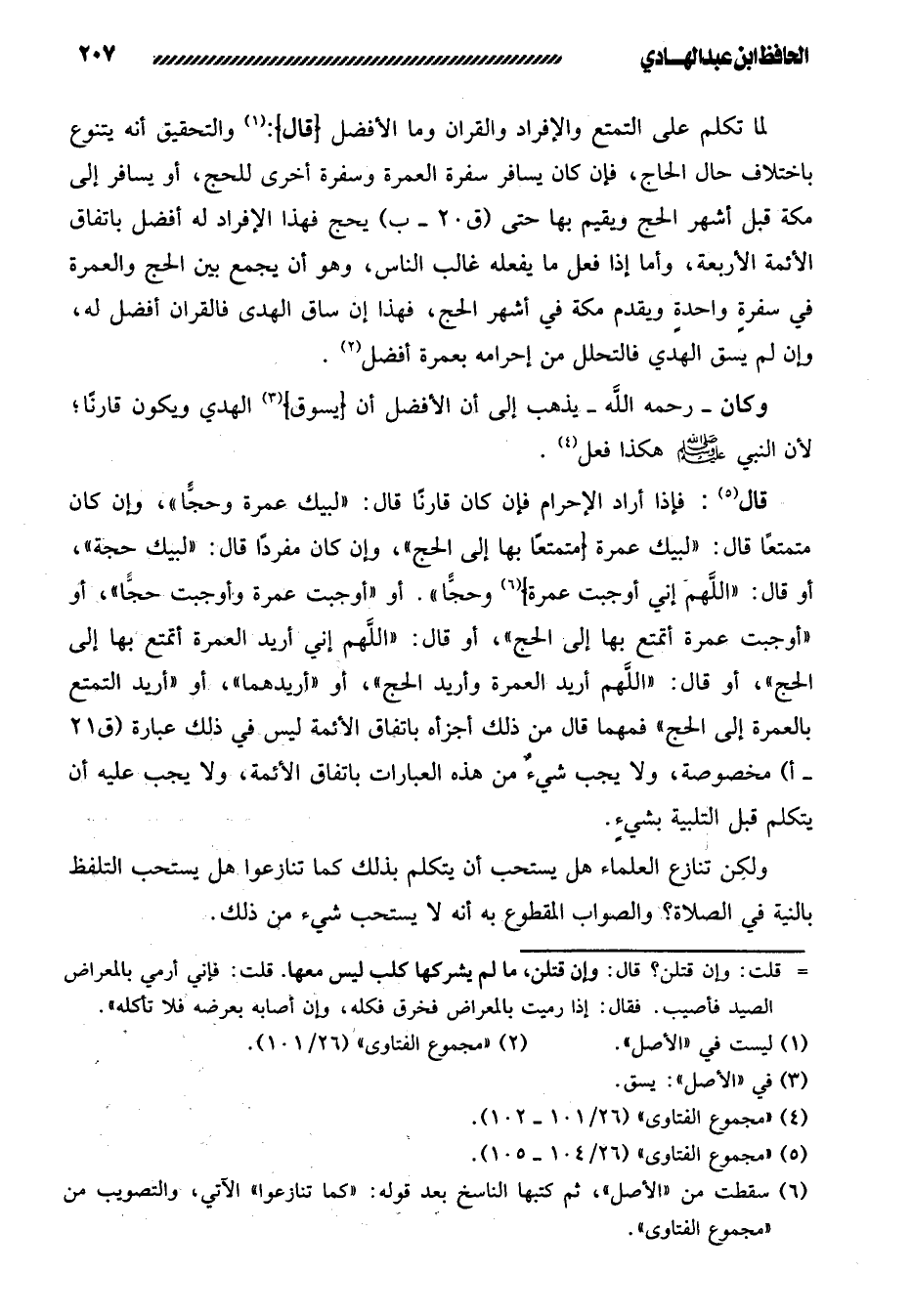 97- لما تكلم على التمتع والإفراد والقران وما الأفضل [قال] : والتحقيق أنه يتنوع باختلاف حال الحاج، فإن كان يسافر سفرة العمرة وسفرة أخرى للحج، أو يسافر إلى مكة قبل أشهر الحج ويقيم بها حتى / يحج فهذا الإفراد له أفضل باتفاق الأئمة الأربعة، وأما إذا فعل ما يفعله غالب الناس، وهو أن يجمع بين الحج والعمرة في سفرةٍ واحدةٍ ويقدم مكة في أشهر الحج، فهذا إن ساق الهدي فالقران أفضل له، وإن لم يسق الهدي فالتحلل من إحرامه بعمرة أفضل.