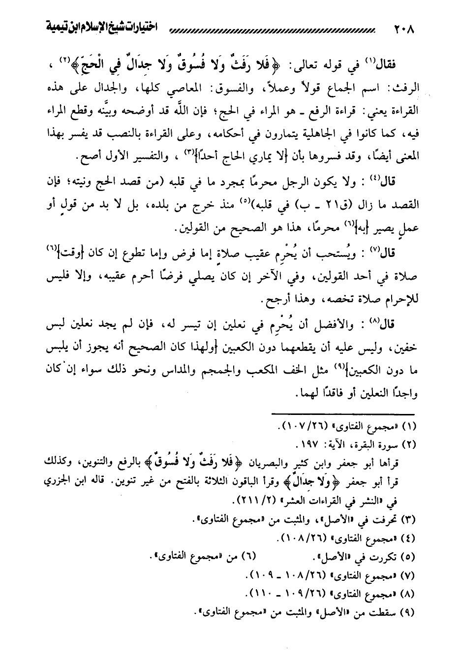 100- فقال في قوله تعالى: {فَلَا رَفَثٌ وَلَا فُسُوقٌ وَلَا جِدَالٌ فِي الْحَجِّ} ، الرفث: اسم الجماع قولاً وعملاً، والفسوق: المعاصي كلها، والجدال على هذه القراءة - يعني: قراءة الرفع - هو المراء في الحج؛ فإن الله قد أوضحه وبيَّنه وقطع المراء فيه، كما كانوا في الجاهلية يتمارون في أحكامه، وعلى القراءة بالنصب قد يفسر بهذا المعنى أيضًا، وقد فسروها بأن [لا يماري الحاج أحدًا] ، والتفسير الأول أصح.