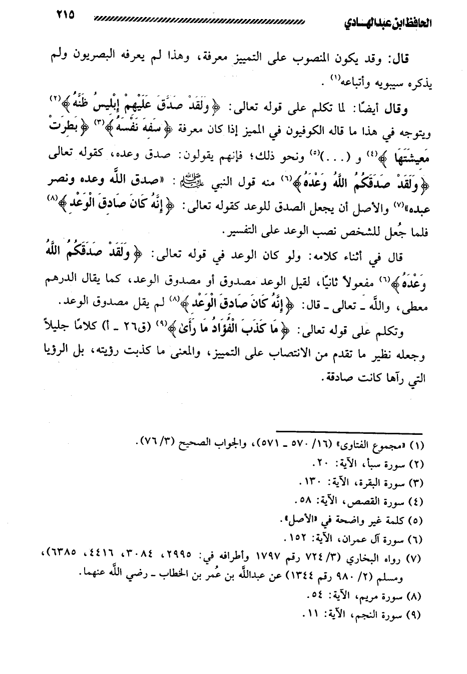 127- وقال أيضًا لما تكلم على قوله تعالى: {وَلَقَدْ صَدَّقَ عَلَيْهِمْ إِبْلِيسُ ظَنَّهُ} : ويتوجه في هذا ما قاله الكوفيون في المميز إذا كان معرفة {سَفِهَ نَفْسَهُ} {بَطِرَتْ مَعِيشَتَهَا} و ( ... ) ونحو ذلك؛ فإنهم يقولون: صدق وعده، كقوله تعالى: {وَلَقَدْ صَدَقَكُمُ اللَّهُ وَعْدَهُ} ومنه قول النبي صلى الله عليه وسلم: «صدق الله وعده ونصر عبده» والأصل أن يجعل الصدق للوعد كقوله تعالى: {إِنَّهُ كَانَ صَادِقَ الْوَعْدِ} فلما جُعل للشخص نصب الوعد على التفسير.