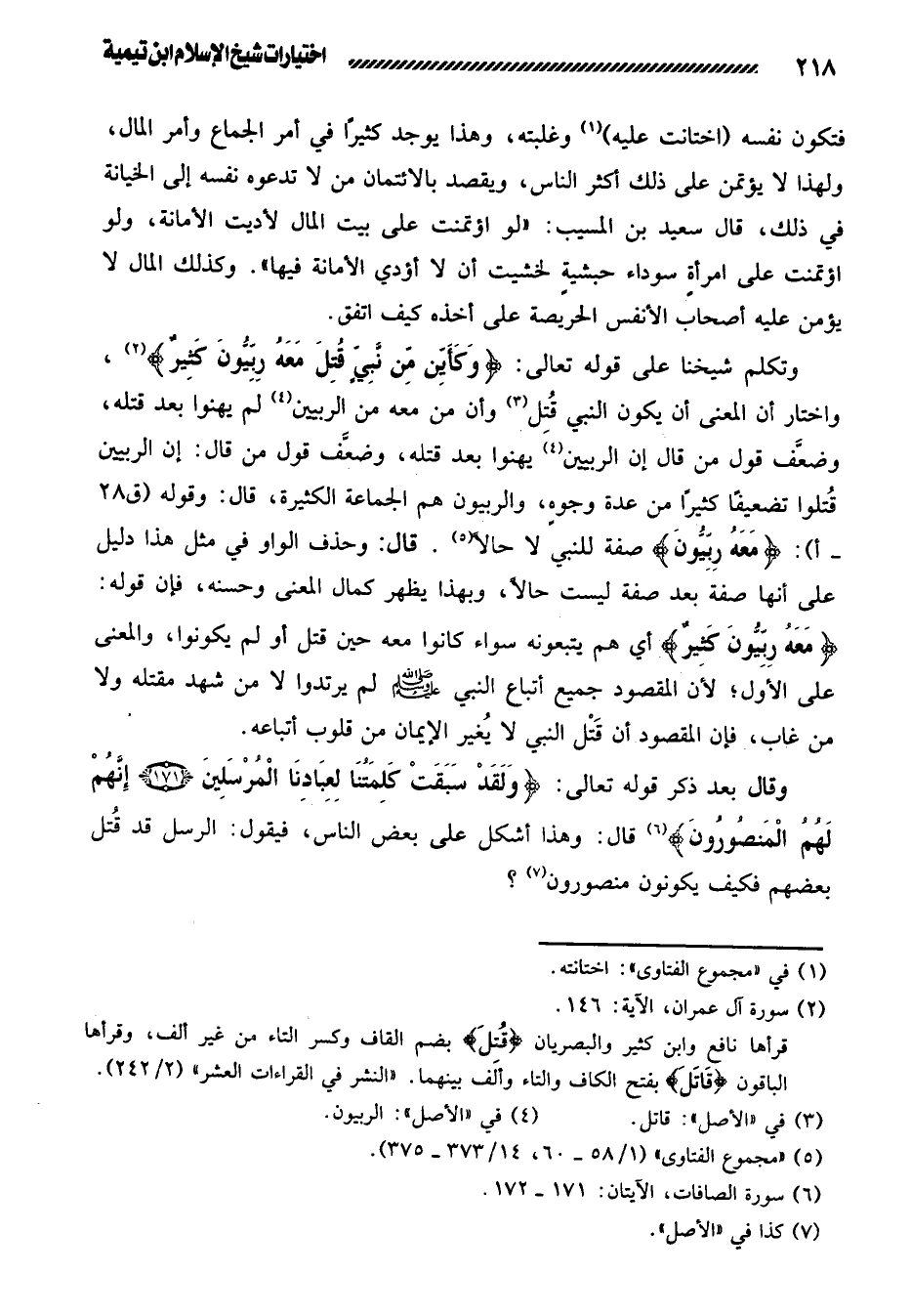 131- وتكلم شيخنا على قوله تعالى: {وَكَأَيِّنْ مِنْ نَبِيٍّ قُتِلَ مَعَهُ رِبِّيُّونَ كَثِيرٌ} ، واختار أن المعنى أن يكون النبي قُتِل وأن من معه من الربيين لم يهنوا بعد قتله، وضعَّف قول من قال: إن الربيين يهنوا بعد قتله، وضعَّف قول من قال: إن الربيين قُتلوا تضعيفًا كثيرًا من عدة وجوهٍ، والربيون هم الجماعة الكثيرة، قال: وقوله: / {مَعَهُ رِبِّيُّونَ} صفة للنبي لا حالاً. قال: وحذف الواو في مثل هذا دليل على أنها صفة بعد صفة ليست حالاً، وبهذا يظهر كمال المعنى وحسنه، فإن قوله: {مَعَهُ رِبِّيُّونَ كَثِيرٌ} أي هم يتبعونه سواء كانوا معه حين قتل أو لم يكونوا، والمعنى على الأول؛ لأن المقصود جميع أتباع النبي صلى الله عليه وسلم لم يرتدوا لا من شهد مقتله ولا من غاب، فإن المقصود أن قَتْل النبي لا يُغير الإيمان من قلوب أتباعه.