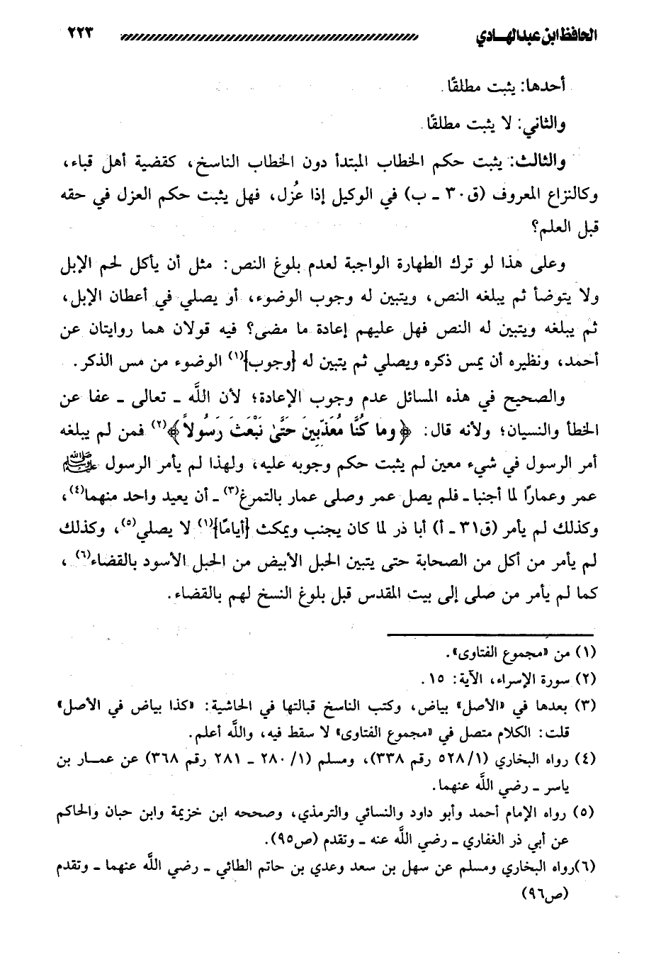 والصحيح في هذه المسائل عدم وجوب الإعادة؛ لأن الله - تعالى - عفا عن الخطأ والنسيان؛ ولأنه قال: {وَمَا كُنَّا مُعَذِّبِينَ حَتَّى نَبْعَثَ رَسُولًا} فمن لم يبلغه أمر الرسول في شيء معين لم يثبت حكم وجوبه عليه، ولهذا لم يأمر الرسول صلى الله عليه وسلم عمر وعمارًا لما أجنبا - فلم يصل عمر وصلى عمار بالتمرغ - أن يعيد واحد منهما، وكذلك لم يأمر / أبا ذر لما كان يجنب ويمكث [أيامًا] لا يصلي، وكذلك لم يأمر من أكل من الصحابة حتى يتبين الحبل الأبيض من الحبل الأسود بالقضاء، كما لم يأمر من صلى إلى بيت المقدس قبل بلوغ النسخ لهم بالقضاء.