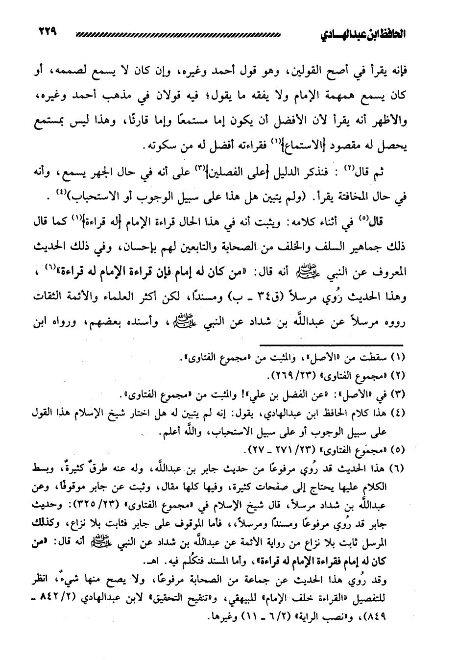 149- قال في أثناء كلامه: وثبت أنه في هذا الحال قراءة الإمام [له قراءة] كما قال ذلك جماهير السلف والخلف من الصحابة والتابعين لهم بإحسان، وفي ذلك الحديث المعروف عن النبي صلى الله عليه وسلم أنه قال: «من كان له إمام فإن قراءة الإمام له قراءة» ، وهذا الحديث رُوي مرسلاً / ومسندًا، لكن أكثر العلماء والأئمة الثقات رووه مرسلاً عن عبد الله بن شداد عن النبي صلى الله عليه وسلم، وأسنده بعضهم، ورواه ابن