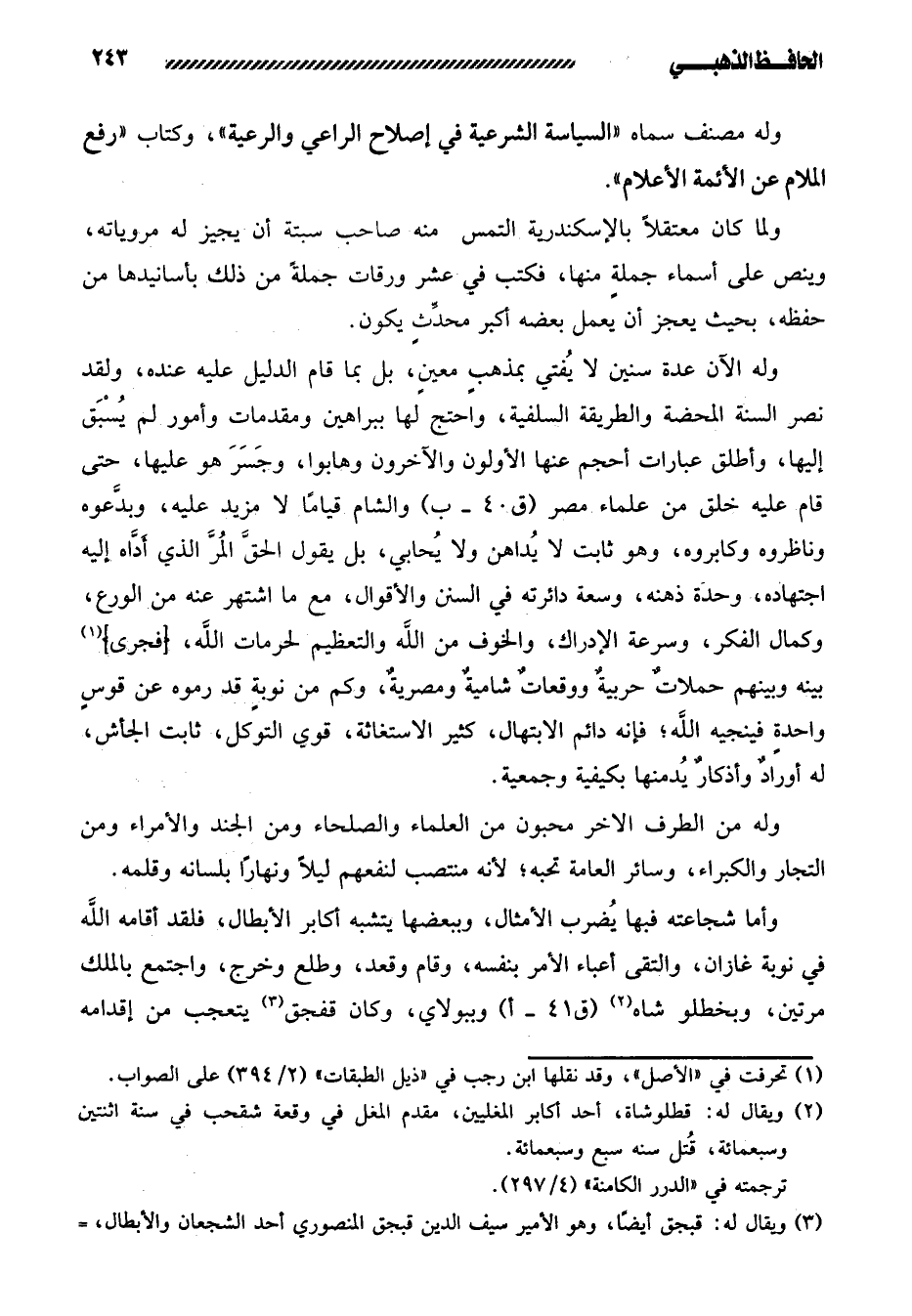 وله مصنف سماه «السياسة الشرعية في إصلاح الراعي والرعية» ، وكتاب «رفع الملام عن الأئمة الأعلام» .