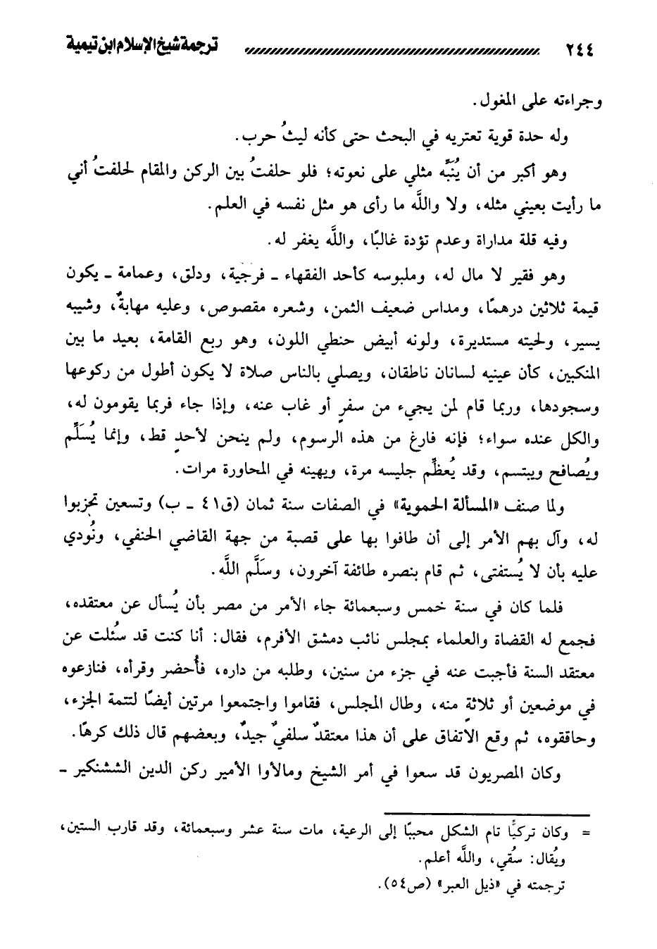 فلما كان في سنة خمس وسبعمائة جاء الأمر من مصر بأن يُسأل عن معتقده، فجمع له القضاة والعلماء بمجلس نائب دمشق الأفرم، فقال: أنا كنت قد سُئلت عن معتقد السنة فأجبت عنه في جزء من سنين، وطلبه من داره، فأُحضر وقرأه، فنازعوه في موضعين أو ثلاثةٍ منه، وطال المجلس، فقاموا واجتمعوا مرتين أيضًا لتتمة الجزء، وحاققوه، ثم وقع الاتفاق على أن هذا معتقدٌ سلفيٌّ جيدٌ، وبعضهم قال ذلك كرهًا.