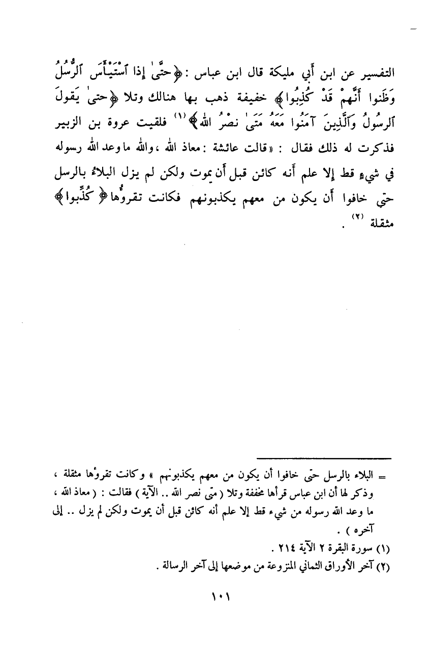 التفسير عَنِ ابْنِ أَبِيْ مُلَيْكَةَ قَالَ ابْنُ عَبَّاسٍ: {حَتَّى إِذَا اسْتَيْأَسَ الرُّسُلُ وَظَنُّواْ أَنَّهُمْ قَدْ كُذِبُواْ} (1) خَفِيْفَةً ذَهَبَ بِهَا هُنَالِكَ وَتَلَا: {حَتَّى يَقُوْل الرَّسُوْلُ وَالَّذِيْنَ آَمَنُوْا مَعَهُ مَتَى نَصْرُ اللهِ} (2) فَلَقِيْتُ عُرْوَةَ بْنَ الزُّبَيْرِ فَذَكَرْتُ لَهُ ذَلِكَ فَقَالَ: قَالَتْ عَائِشَةُ: مُعَاذَ اللهِ وَاللهِ مَا وَعَدَ اللهُ رَسُوْلَهُ فِيْ شَيْءٍ قَطُّ إِلَّا عَلِمَ أَنَّهُ كَائِنٌ قَبْلَ أَنْ يَمُوْتَ وَلَكِن لَمْ يَزَلِ الْبَلَاءُ بِالرُّسُلِ حَتَّى خَافُوْا أَنْ يَكُوَُْنَ مَنْ مَعَهُمْ يَكْذِبُوْنَ فَكَانَتْ تَقْرَؤُهَا كُذِّبُوْا- مثقلة.