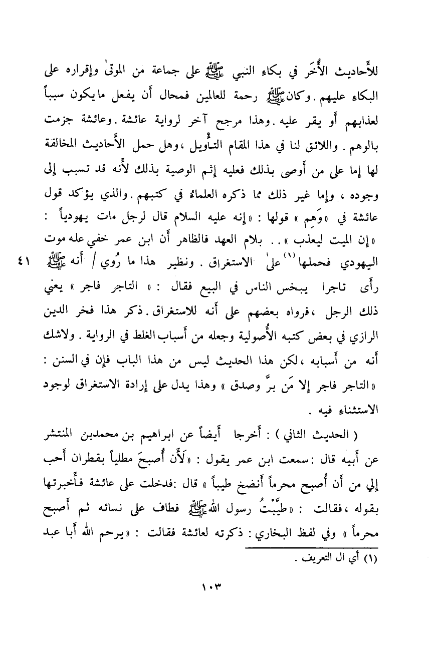 لِلْأَحَادِيْثِ الْأُخَر فِيْ بُكَاءِ النَّبِيِّ صَلَّى اللهُ عَلَيْهِ وَسَلَّمَ عَلَى جَمَاعَةٍ مِنَ الْمَوْتَى وَإِقْرَارُهُ عَلَى الْبُكَاءِ عَلَيْهِمْ وَكَانَ صَلَّى اللهُ عَلَيْهِ وَسَلَّمَ رَحْمَةً لِّلْعَالَمِيْنَ فمحال أن يفعل مَا يَكُوْنُ سببا لعذابهم أَوْ يقر عَلَيْهِ وهَذَا مرجح آخر لرِوَايَة عَائِشَة وعَائِشَة جزمت بالوهم واللائق لَنَا فِي هَذَا المقام التَّأْوِيْل وهو حمل الْأَحَادِيْث المخالفة لَهَاأَمَّا عَلَى من أَوْْصَى بذَلِكَ فعَلَيْهِ إثم الوصية بذَلِكَ لِأَنَّهُ قَدْ تسبب إِلَى وجوده وأَمَّا غيرذَلِكَ مِمَّا ذكره الْعُلَمَاء فِي كتبهم.