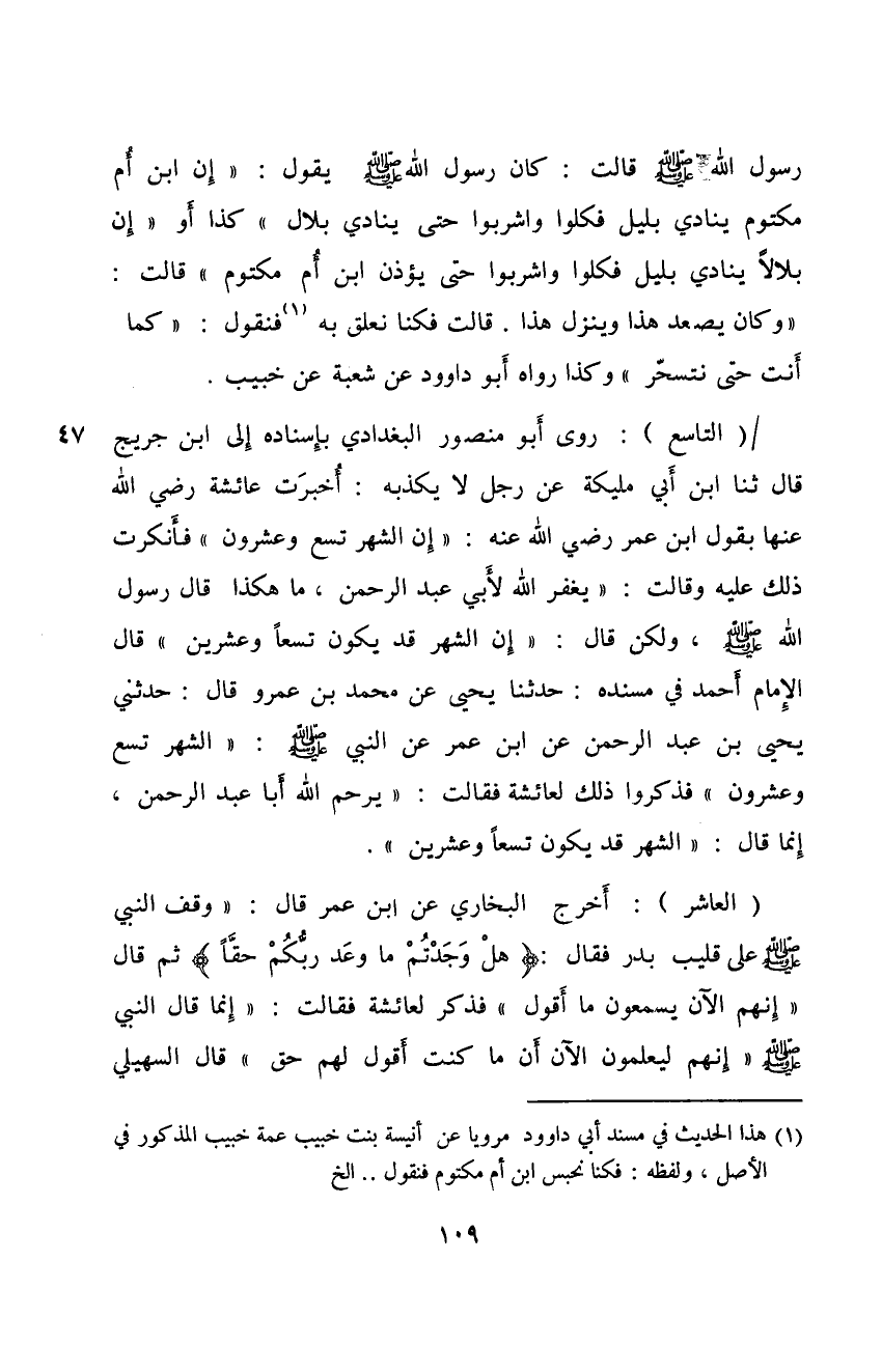 قَالَ: الْإِمَام أَحْمَد فِيْ مُسْنَدِهِ: حَدَّثَنَا يَحْيَى عَنْ مُحَمَّد عَنِ النَّبِيِّ صَلَّى اللهُ عَلَيْهِ وَسَلَّمَ الشهر تسع وعشرون فذكروا ذَلِكَ لعَائِشَة فَقَالَتْ: يرحم الله ِأَبَا عَبْد الرَّحْمَن إِنَّمَا قَالَ: الشهر قَدْ يَكُوْنُ تسعا وعشرين.