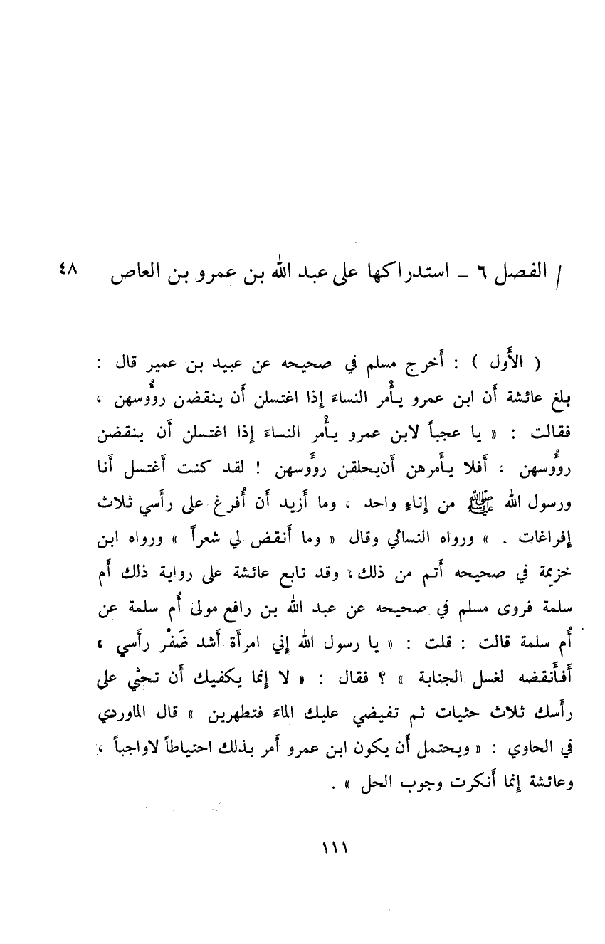 أَخْرَجَ مُسْلِمٌ فِيْ صَحِيْحِهِ عَنْ عُبَيْدِ بْنِ عُمَيْرٍقَالَ: بَلَغَ عَائِشَة أَنَّ ابْنَ عَمْرو يَأْمُرُ النِّسَاء إِذَا اغتسلن أن ينقضن رؤوسهن فَقَالَتْ: يَا عجبا لابن عَمْرو يَأْمُرُ النِّسَاء إِذَا اغتسلن أن ينقضن رؤوسهن أفلا يَأْمُرُهن أن يحلقن رؤوسهن لَقَدْ كُنْت أغتسل أَنَا ورَسُوْل اللهِ صَلَّى اللهُ عَلَيْهِ وَسَلَّمَ من أَنَاء وَاحِد وما أزَيْد أن أفرغ عَلَى رأسي ثَلَاث إفراغات.