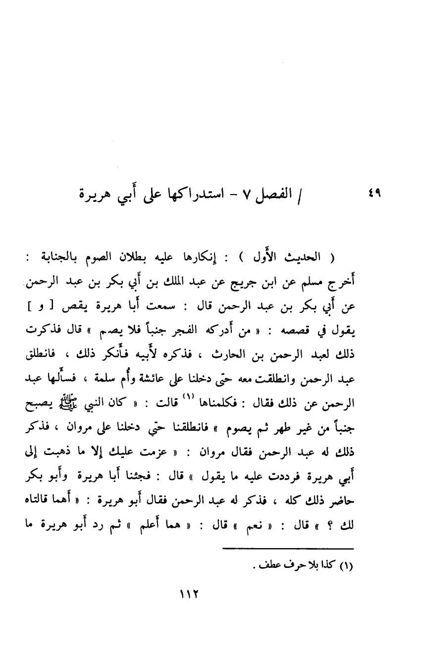 أَخْرَجَ مُسْلِمٌ عَنِ ابْنِ جُرَيْج عَنْ عَبْدِ الْمَلِكِ بْن أَبِيْ بَكْرٍ بْن عَبْد الرَّحْمَن عَنْ أَبِيْ بَكْرٍ بْن عَبْد الرَّحْمَن قَالَ: سَمِعت أَبِيْ هُرَيْرَةَيقص وَيَقُوْل فِي قصصه: من أدركه الْفَجْر جنبا فَلَا يصم" قَالَ: فذكرت ذَلِكَ لِعَبْدِ اللهِ بْن الْحَارِث فذكره لأبيه فأَنْكَرَذَلِكَ فانطلق عَبْد الرَّحْمَن وانطلقت معه حَتَّى دخلناعَلَى عَائِشَة وأُمّ سَلَمَةَ فسَأَلَهَا عَبْد الرَّحْمَن عَنْ ذَلِكَ فَقَالَ: فكلمناها قَالَتْ: كَأَنَّ النَّبِيَّ صَلَّى اللهُ عَلَيْهِ وَسَلَّمَ يصبح جنبا من غَيْر طهر ثُمَّ يَصُوْم فانطلقنا حَتَّى دخلنا عَلَى مَرْوَان فذكر ذَلِكَ لَهُ عَبْد الرَّحْمَن فَقَالَ: مروان: عزمت عَلَيْك إِلَّا مَا ذهبت إِلَى أَبِيْ هُرَيْرَةَ فرددتَ عَلَيْهِ مَا يَقُوْل. قَالَ: فجِئْنَا أَبَا هُرَيْرَةَ وأَبُوْ بَكْرٍ حاضر ذَلِكَ كله فذكر لَهُ عَبْد الرَّحْمَن فَقَالَ: أَبُوْ هُرَيْرَةَ: أَهُمَا قَالَت: اهُ لَكَ؟ قَالَ: نَعَمْ. قَالَ: هُمَا أَعْلَمُ. ثُمَّ رد أَبُوْ هُرَيْرَةَ ما