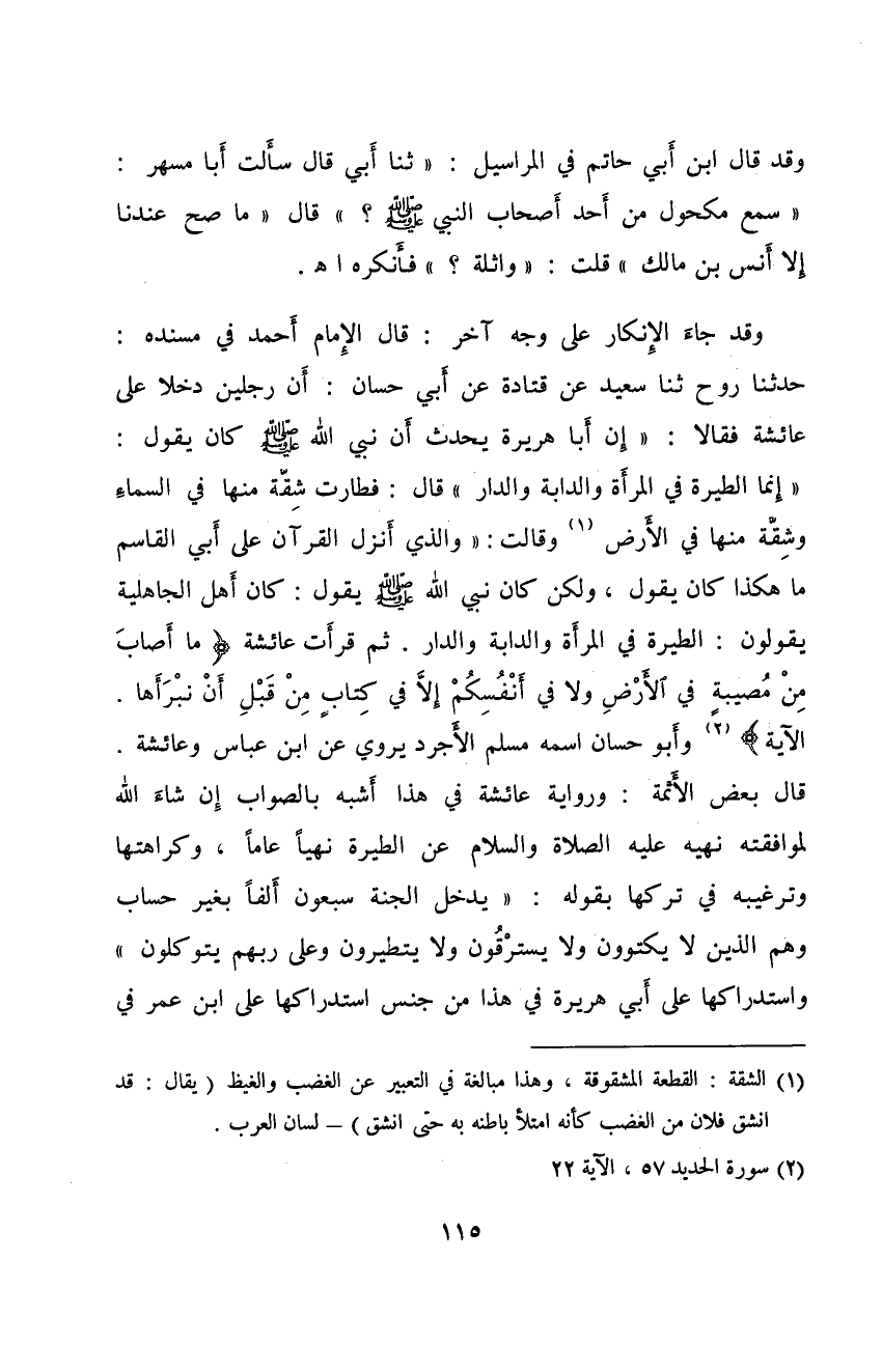وقَدْ جَاءَ الْإِنْكَار عَلَى وجه آخر قَالَ: الْإِمَام أَحْمَد فِيْ مُسْنَدِهِ حَدَّثَنَا روح ثَنَا سَعِيْد عَنْ قَتَادَةَ عَنْ أَبِي حسان أن رجلين دخلا عَلَى عَائِشَة فَقَالَ: اإن أَبَا هُرَيْرَةَ يحَدَّثَ أن نبي الله ِصَلَّى اللهُ عَلَيْهِ وَسَلَّمَ كَانَ يَقُوْل إِنَّمَا الطيرة فِي الْمَرْأَةو الدابة وَالدار قَالَ: فطارت شقة مِنْهَا فِي السَّمَاء وَشقة مِنْهَا فِي الْأَرْض وقَالَتْ: والَّذِيْ أنَزَلَ الْقْرْآن عَلَى أَبِي الْقَاسِم مَا هَكَذَا كَانَ يَقُوْل الطيرة فِي الْمَرْأَةو الدابة وَالدار ثُمَّ قرأت عَائِشَة ماأصاب من مصيبة قي الْأَرْض وَلَا فِي انفسكم إِلَّا فِي كِتَاب من قبل أن نبرأها الْآَيَة وأَبُو حسان اسمه مُسْلِم الجرد يَرْوِيْ عَنِ ابْنِ عَبَّاسٍ وعَائِشَة قَالَ بَعْضُ الْأَئِمَّة ورِوَايَة عَائِشَة فِي هَذَا أشبه بالصواب إِنْ شَاءَ اللهُ لمُوَافِقته نَهْيه عَلَيْهِ الصَّلَاة وَالسَّلَام عَن الطيرة نَهْيًا عأَمَّا وكراهتها وَترغيبه فِي عركها بِقَوْلِه يَدْخُل الْجَنَّة سبعون ألفا بغير حساب وهم الَّذِيْنَ لَا يكتوون وَلَا يسترقون وَلَا يتطيرون وعَلَى ربهم يتوكلون وَاسْتِدْرَاكُهَا عَلَى أَبِيْ هُرَيْرَةَ فِي هَذَا من جنس اسْتِدْرَاكُهَا عَلَى ابْن عُمَر فِي
