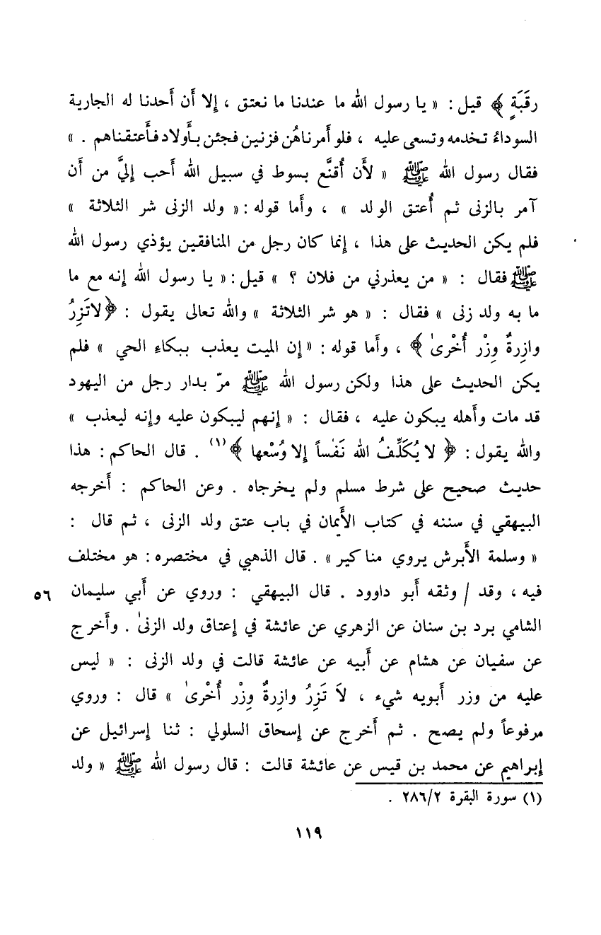 قَالَ الْبَيْهَقِيُّ: ورُوِيَ عَنْ أَبِي سُلَيْمَان الشَّامي برد بْن سنان عَنِ الزُّهْرِيِّ عَنْ عَائِشَةَ فِي إعتاق ولد الزنى لَيْسَ عَلَيْهِ من وزر أَبُويه شَيْء {لَا تزر وازرة وزر أُخْرَى} قَالَ: ورُوِيَ مَرْفُوْعًا ولم يَصِحُّ.