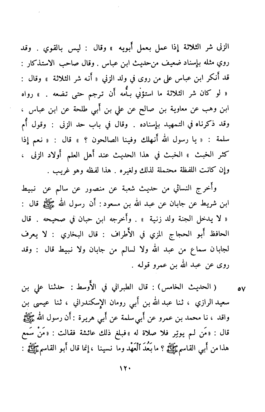الزنى شر الثَّلَاثَة إِذَا عمل بعمل أَبُويه وَقَالَ: لَيْسَ بالقوي وقَدْ رُوِيَ مثله بإِسْنَاد ضَعِيْف مِنْ حَدِيْثِ ابْن عَبَّاسٍ وقَالَ: صَاحِب إِلَّاستذكار قَدْ أَنْكَرَابْن عَبَّاسٍ عَلَى من رَوَى فِي ولد الزنى أَنَّهُ شر الثَّلَاثَة وَقَالَ: لَوْ كَانَ شر الثَّلَاثَة مَا استؤني بأمه أن تَرْجَمَ حَتَّى تضعه رَوَاهُ ابْن وَهْبٍ عَن مُعَاوِيَةُ بْن صَالِح عَن عَليّ بْن أَبِي طَلْحَة عَنِ ابْنِ عَبَّاسٍ وقَدْ ذكرناه فِي التم هِيَ د بإِسْنَاده وَقَالَ: فِي بَاب حد الزنى وقَوْل أُمّ سَلَمَةَ يَا رَسُوْلَ اللهِ أنهلك وفِي نا الصَالِحون قَالَ: نعم إِذَا كثر الخبث الخبث فِي هَذَا الْحَدِيْث عِنْدَ أَهْل الْعِلْم أولاد الزنى وَإن كَانَتْ اللفظة محتملة لذَلِكَ وَلغيره هَذَا لفظه وَهُوَ غريب