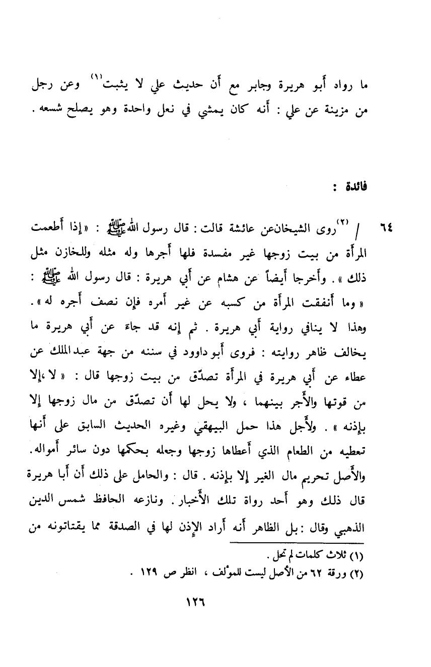 ... ثُمَّ أَنَّهُ قَدْ جَاءَ عَنْ أَبِيْ هُرَيْرَةَ مَا ي خَالَفَظَاهِر روايته. فرَوَى أَبُوْدَاوُدَ فِيْ سُنَنِهِ مِنْ جِهَةِ عَبْد الْمَلِكِ عَن عَطَاء عَنْ أَبِيْ هُرَيْرَةَ فِي الْمَرْأَة تصدق من بَيْت زوجها قَالَ: لَا إِلَّا من قوتها وَالْأَجْر بينهما وَلَا يَحِلّ لَهَاأن تصدق من مال زوجها إِلَّا بإذنه.