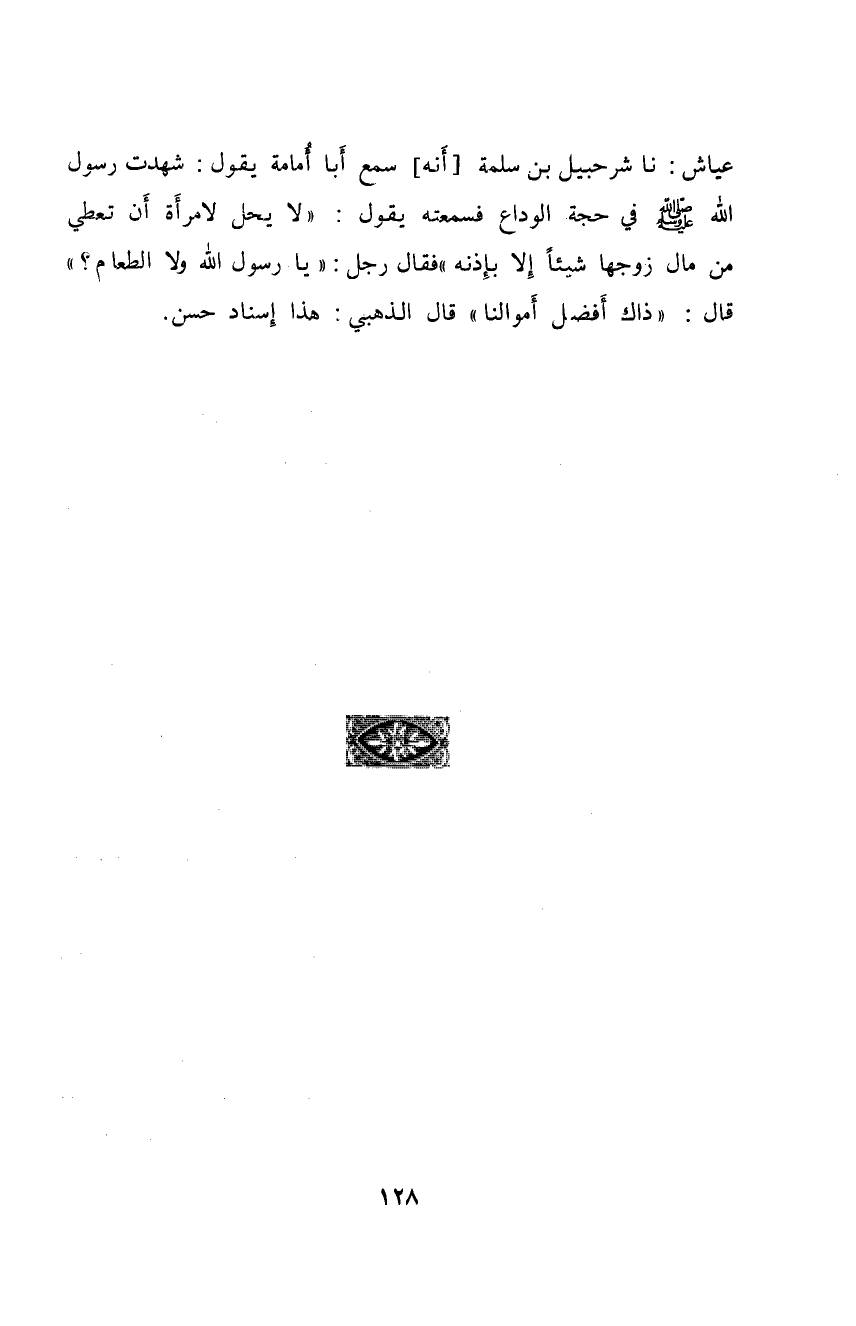 عياش نا شرحبيل بْن سَلَمَة أَنَّهُ سَمِعَ أَبَاأُمَامَةَ يَقُوْل: شهدت رَسُوْل اللهِ صَلَّى اللهُ عَلَيْهِ وَسَلَّمَ فِي حِجَّة الْوِدَاعِ فسمعته يَقُوْل: لَا يَحِلّ لامرأة أن تعطي من مال زوجها شَيْئًا إِلَّا بإذنه فَقَالَ رَجُلٌ: يَا رَسُوْلَ اللهِ وَلَا الطَّعَام قَالَ: ذاك أَفْضَل أموالنا.