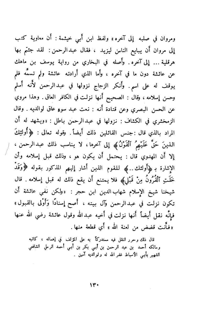 وقَوْله تَعَالَى: {أولئك الَّذِيْنَ حق عَلَيْهِم القَوْل} إِلَى آخرها لَا يناسب ذَلِكَ عَبْد الرَّحْمَن إِلَّا أن المهدوي قَالَ: يَحْتَمِل أن يَكُوْنُ هُوَ وذَلِكَ قبل إِسْلَامه وأن إِلَّاشَارَة بِـ" أُولَئِكَ" للقَوْم الَّذِيْنَ أَشَارَ إِلَيْهِم الْمَذْكُوْر بِقَوْلِه: {وقَدْ خلت القرون من قبلي} فَلَا يمتنع أن يقع ذَلِكَ لَهُ قبل إِسْلَامه قَالَ: شَيْخُنَا شيخ الْإِسْلَام شهاب الدّيْن ابْن حجر ولَكِن نفِي عَائِشَة أن تَكُوْن نَزَلَت فِي عَبْد الرَّحْمَن وآل بَيْته أَصَحُّ إِسْنَادا وأولى بالقبول فَإِنَّهُ نَقَلَ أَيْضًا أَنَّهَا نَزَلَت فِي أَخِيْه عَبْد اللهِ وقَوْل عَائِشَة رَضِيَ اللهُ عَنْهُا فأَنْت قضض من لعنة الله ِأي قطعة مِنْهَا
