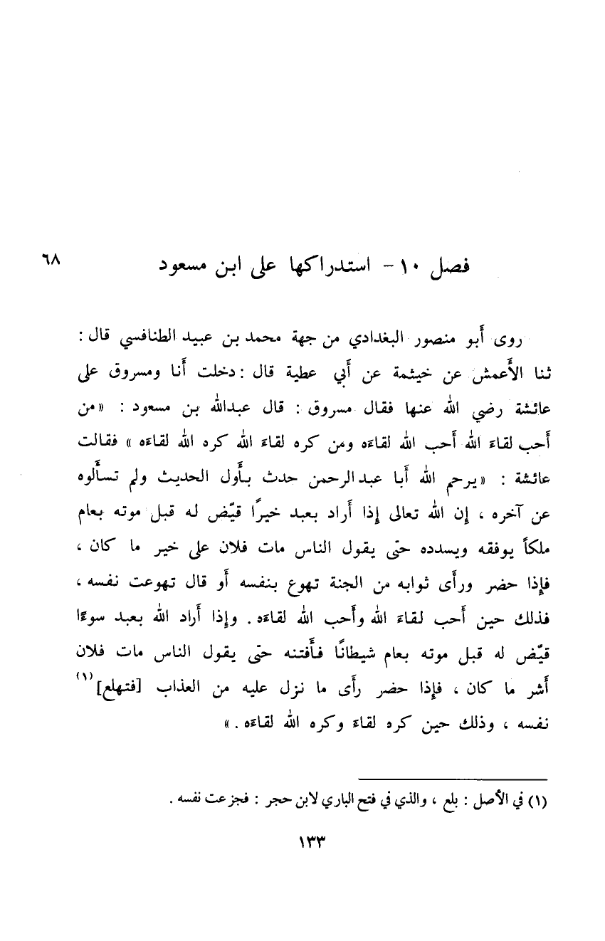 رَوَى أَبُوْ مَنْصُوْرٍ الْبَغْدَاديّ مِنْ جِهَةِ مُحَمَّد بْن عُبَيْد الطنافسي قَالَ: ثَنَا الْأَعْمَشُ عَن خيثمة عَنْ أَبِي عطية قَالَ: دخلت أَنَا ومَسْرُوْق عَلَى عَائِشَةرَضِيَ اللهُ عَنْهُا فَقَالَ: مَسْرُوْق قَالَ: عَبْد اللهِ بْنُ مَسْعُوْد من أحب لقاء الله ِأحب الله ِلقاءه ومن كَرِهَ لقاء الله ِكَرِهَ الله ِلقاءه فَقَالَتْ عَائِشَةُُ: يرحم الله ِأَبَا عَبْد الرَّحْمَن حَدَّثَ بأول الْحَدِيْث ولم تسَأَلَوه عَن آخره أَنَّ اللهَ تَعَالَى إِذَا أَرَادَ ب عَبْد خيرا قيض لَهُ قبل موته بعام ملكا يوفقه ويسدده حَتَّى يَقُوْل النَّاس مَاتَ فلِأَنَّ عَلَى خير مَا كَانَ فإِذَا حضر ورَأَى ثوابه من الْجَنَّة تهُوَع بنفسه أَوْ قَالَ: تهُوَعت نفسه فذَلِكَ حِيْنَ أحب لقاء الله ِوأحب االله ِلقاءه وإِذَا أَرَادَ الله ِب عَبْد سوءا قيض لَهُ قبل موته بعام شيطأَنَا فأفتنه حَتَّى يَقُوْل النَّاس مَاتَ فلِأَنَّ أشر مَا كَانَ فإِذَا حضر رَأَى مَا نَزَلَ عَلَيْهِ من العذاب فتهلع نفسه وذَلِكَ حِيْنَ كَرِهَ لقاء وكره الله ِلقاءه