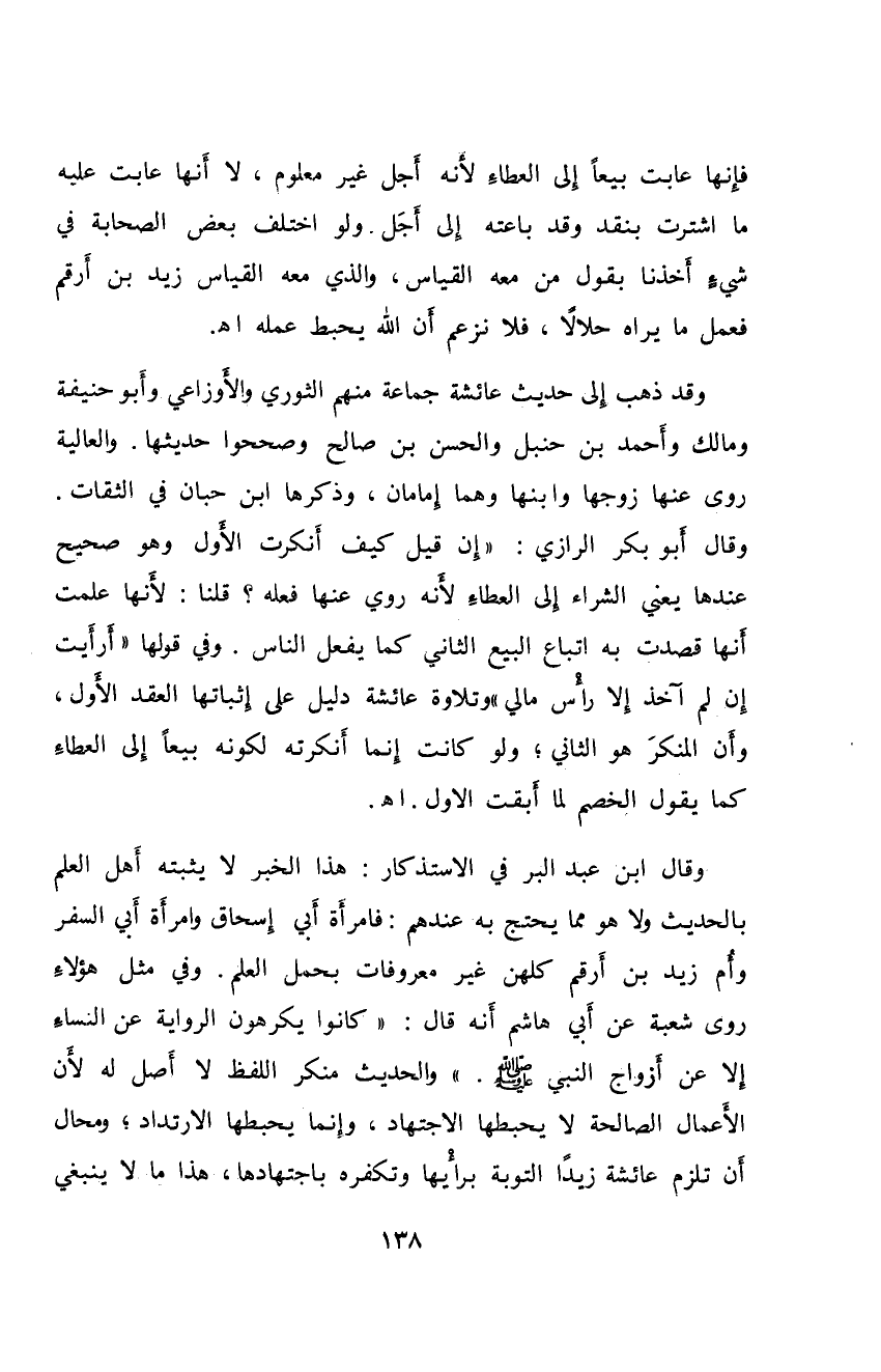 قَالَ ابْنُ عَبْدِ الْبَرِّ فِي إِلَّاستذكار هَذَا الخبرلا يثبته أَهْل الْعِلْم بالْحَدِيْث وَلَا هُوَ مِمَّا يحتج بِهِ عِنْدَهم فامرأة أَبِيْ إِسْحَاقَ وامرأة أَبِي السفر وأم زَيْد بْن أرقم كلهن غَيْر معروفات بحمل الْعِلْم وفِي مثل هَؤُلَاءِ رَوَى شُعَبة عَنْ أَبِي هاشم أَنَّهُ قَالَ: كَانُوْا يكرهُوَن الرِّوَايَة عَن النِّسَاء إِلَّا عَن أَْزْوَاج النَّبِيِّ صَلَّى اللهُ عَلَيْهِ وَسَلَّمَ وَالْحَدِيْث منكر اللفظ لَا أصل لَهُ لِأَنَّ إِلَّاعمال الصَالِحة لَا يُحِبّ طها إِلَّاجتهاد وإِنَّمَا يُحِبّ طها إِلَّارتداد ومحال أن تلزم عَائِشَة زَيْدا برأيا وتكفره باجتهادها هَذَا مَا لَا يَنْبَغِيْ