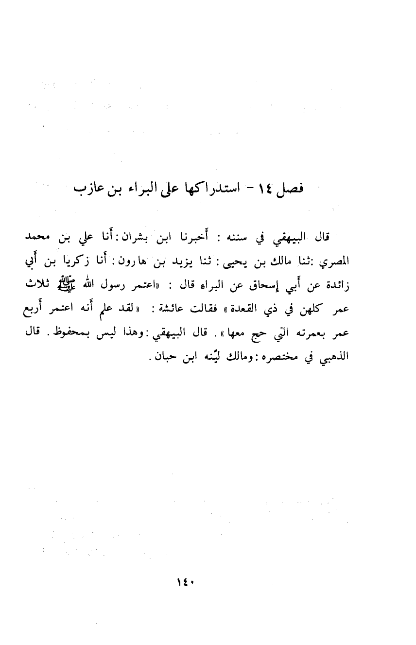 قَالَ الْبَيْهَقِيُّ: فِيْ سُنَنِهِ أَخْبَرَنَا ابْن بشران أَنَا عَليّ بْن مُحَمَّد الْمِصْرِيّ ثَنَا مَالِك بْن يَحْيَى ثَنَا يَزَيْدُ بْنُ هارون أَنَا زَكَرِيَّا بْن أَبِي زائدة عَنْ أَبِيْ إِسْحَاقَ عَن البراء قَالَ: اعتمر رَسُوْل اللهِ صَلَّى اللهُ عَلَيْهِ وَسَلَّمَ ثَلَاث عُمَر كلهن فِي ذي القعدة فَقَالَتْ عَائِشَةُُ: لَقَدْ علم أَنَّهُ اعتمر أربع عُمَر بعُمَرته الَّتِيْ حج معها قَالَ الْبَيْهَقِيُّ: وهَذَا لَيْسَ بمحفوظ قَالَ الذَّهَبِيُّ فِي مُخْتَصَره ومالك لينه ابْن حِبَّان