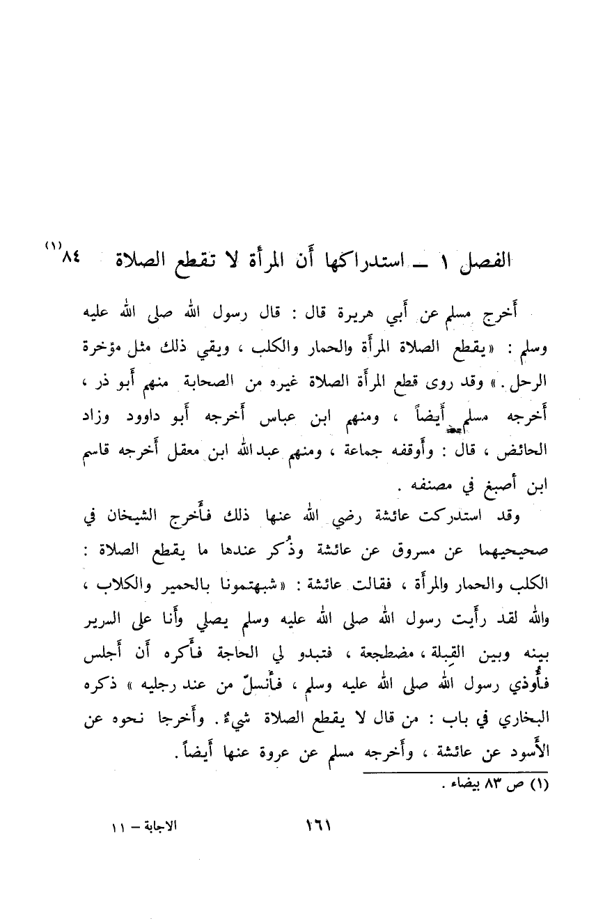 ... وقَدْ استدركت عَائِشَة رَضِيَ اللهُ عَنْهُا ذَلِكَ فأَخْرَجَ الشَّيْخَانِ فِيْ صَحِيْحِيهما عَن مَسْرُوْق عَنْ عَائِشَةَ وذكر عِنْدَهَا مَا يَقْطَعُ الصَّلَاة الكلب وَالحِمَار وَالْمَرْأَة فَقَالَتْ عَائِشَةُُ: شبهتموها بالحمير وَالكلاب وَالله ِلَقَدْ رَأَيْتُ رَسُوْلَ اللهِ يُصَلِّيْ وأَنَا عَلَى السرير بينه وبين القبلة مضطجعة فتبدو لِيْ الْحَاجّة فأكره أن أجلس فأوذي رَسُوْل اللهِ صَلَّى اللهُ عَلَيْهِ وَسَلَّمَ فأَنَسل من عِنْدَ رجليه.