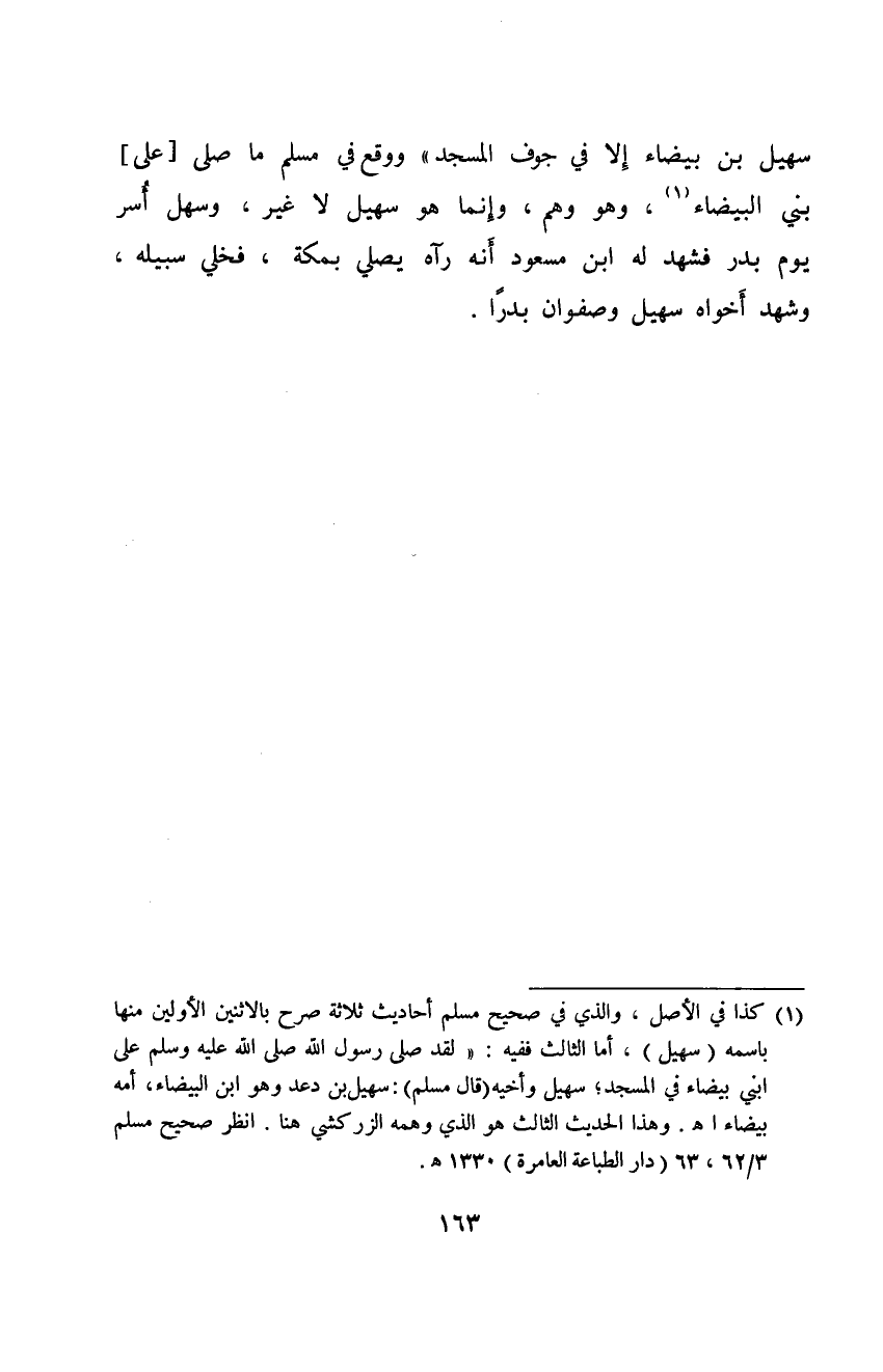 سُهَيْل بْن بيضاء إِلَّا فِي جوف الْمَسْجِدووَقَعَ فِي مُسْلِم مَا صَلَّى عَلَى بني الْبَيْضَاء وَهُوَ وهم وإِنَّمَا هُوَ سُهَيْل لَا غَيْر وسهل أسر يَوْم بدر فشهد لَهُ ابْن مَسْعُوْد أَنَّهُ رآه يُصَلِّيْ بِمَكَّةَ فخلي سبيله وشهد أخواه سُهَيْل وصفوان بدرا