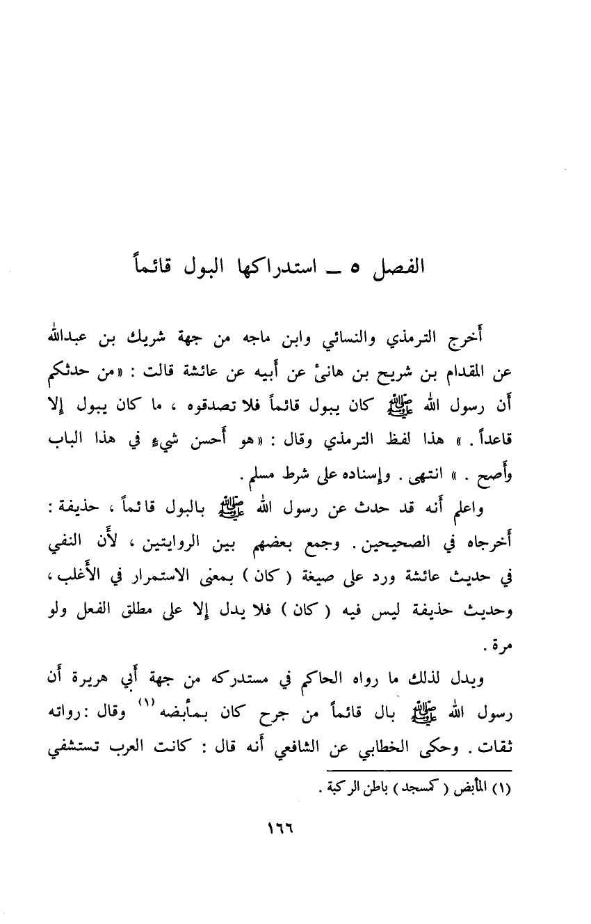 أَخْرَجَ التِّرْمَذِيُّ وَالنَّسَائِيّ وابن ماجه مِنْ جِهَةِ شريك بْن عَبْد اللهِ عَن المقَدْام بْن شُرَيْح بْن هَانِئ عَنْ أَبِيْهِ عَنْ عَائِشَةَ قَالَتْ: من حَدَّثَكم إِنَّ رَسُوْلَ اللهِ صَلَّى اللهُ عَلَيْهِ وَسَلَّمَ كَانَ يَبُوْل قَائِما فَلَا تصدقوه مَا كَانَ يَبُوْل إِلَّا قَاعِدًا.